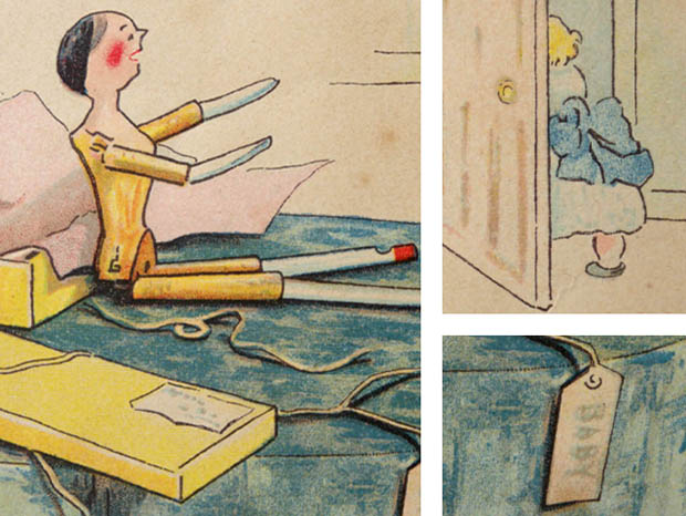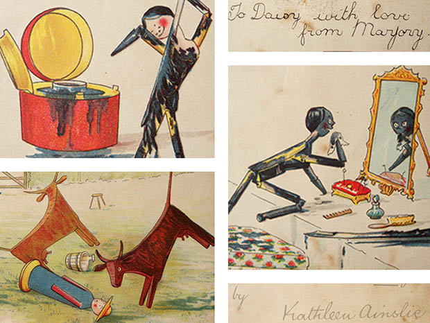 イギリスのロンドンにあるCastell Brothers Ltd.(キャステル・ブラザーズ出版社)とアメリカのニューヨークにあるFrederick A. Stokes Company(フレデリック・アボット・ストークス出版社)がおそらく1900年代に同時に出版した厚紙製のディア・ダーティ・ドーリー・ペグドールピクチャーブックです。Peg Doll(ペグドール)はイタリアの南チロル地方のヴァル・ガルデーナの町で作られた木製のドールが始まりのようですが、その後ドイツやオランダやアメリカで多く製作されたようです。また、Peg Doll(ペグドール)の名前はClothespeg(クロスペグ/洗濯バサミ)のペグから付けられたようです。また、初期の頃のペグドールは木製の洗濯バサミの側面に穴を空けて腕になる木の棒を差し込んだだけのものでしたが、その後にお顔の彩色がされ腕や脚はジョイントで動かせるようになったようです。また、ペグドールは衣服を着せられていない状態で販売されていたようなのでチャイルド達は布切れから自分でドレスを作ったようです。また、ペグドールはPenny Doll(ペニードール)とも呼ばれていますが、これは1ポンドの100分の1のペニー(1セント)の価格のドールのことのようです。また、ペグドールは当時は高価なビスクドールが買えない庶民のチャイルド達のドールでしたが、今では世界中で人気が高くてとても高価なドールになっているようです。こちらは超激レアなペグドール達がデザインされたPicture Book(ピクチャーブック/絵本)で、本体は表紙を入れて全部で32ページあり中ページは文章とカラーイラストが16点でモノクロイラストが1点あります。また、本体はオレンジのシルクのフリンジのある紐で中綴じされているのも素敵です。また、モスグリーンの縁取りがあるアイボリーグリーンの表紙にはDear Dirty Dolly(ディア・ダーティ・ドーリー/親愛なる汚れたドーリーへ)のタイトルと赤い帽子をかぶってグリーンの服を着たベビーの後ろ姿とベビーと書かれた厚紙のタグと座りながらベビーに抱っこしてもらいたくて両手を差し出しているペグドール、裏表紙には羽根ペンと赤いインク壺のイラストがデザインされていています。表紙の裏にはTo Daisy with love from Marjory(デイジーへ、マージョリーより愛を込めて)と手書きで書かれていのす。また、中ページの最初にはDear Dirty Dolly, by Kathleen Ainslie(キャスリーン・エインズリー作) Castell Brothers Ltd. London(ロンドンにあるキャステル・ブラザーズ出版社) New York, Frederick A. Stokes Company(ニューヨークにあるフレデリック・アボット・ストークス出版社) Designed in England(イギリスでデザイン) Printed in Bavaria(ドイツのバイエルンで印刷)の表示があります。また、1858年にイギリスのサマセット州のコーフの町で生まれたキャスリーン・エインズリーは、1900年から1911年頃に活躍したイラストレーターのようです。また、彼女は19世紀から20世紀初頭にかけて人気があったジョイント式のペグドールを題材にした絵本の出版で有名なようです。また、1878年に創設されたキャステル・ブラザーズ出版社は、バレンタインカードやクリスマスカードの出版で有名なようです。また、フレデリック・アボット・ストークス出版社は、1881年にフレデリック・アボット・ストークスが創設していますが、1939年までの58年間で3,000冊以上の書籍を出版しているよです。また、その次のページからは、Baby wouldn't look at me(ベビーは私を見てくれなかった) She wanted a black dolly and I was born white(彼女は黒い人形が欲しかったのに私は白く生まれたの) What shall I do?(どうしよう) Ah! I know!(ああ、分かった)の文章と部屋を出て行くベビーの後ろ姿とベットの上に置かれた真新しいパッケージから出されたばかりの悲観に暮れているペグドールのイラストがデザインされていますが、お話は黒い人形になるためにインク壺の黒いインクで体を黒く塗って髪にリボンを付けて一番素敵なショールを羽織っておめかししたペグドールでしたが、乳母に見つかり汚いと言われてバケツに入れられてしまいます。そして、乳母はペグドールを洗ってもきれいにならないので窓から放り投げました。外に出たペグドールはベビーを探しに畑や庭に探しに行きますが、この後ペグドールはどうなってしまうのでしょうか。また、イラストは高価な全て特色を使った石版印刷で刷られているので何年経っても発色がよくて素晴らしいですね。120年も前のペグドールのピクチャーブックですが、見ているだけでペグドールが欲しくなってしまいそうな超激レアな大変価値ある一品です。