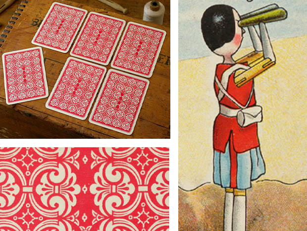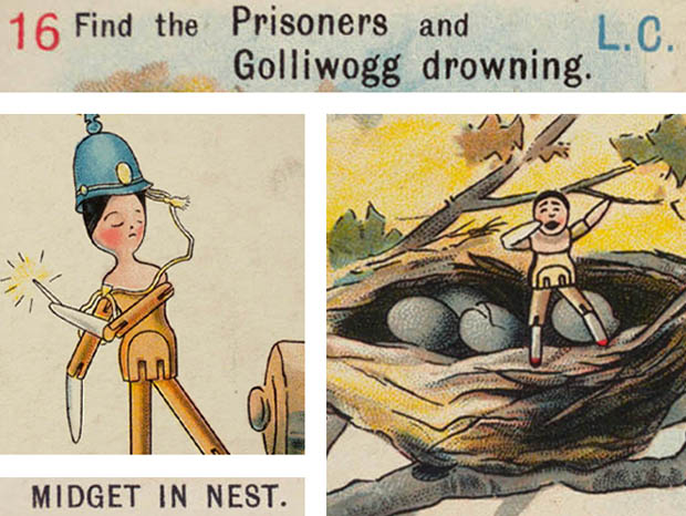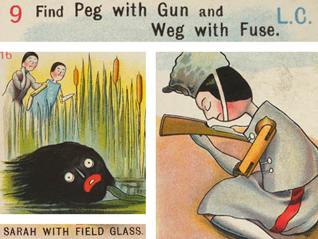 ロンドンで1821年にThomas De La Rue(トーマス・デ・ラ・ルー)が創設したバンヒル・ロウ通りにあるトーマス・デ・ラ・ルー社が、おそらく1900年代に製造した厚紙製のゴリウォーグ&ペグドール・ゲームカード6セットです。トーマス・デ・ラ・ルー社は麦わら帽子製造から創業したようですが、1831年には製造したトランプがイギリス王室御用達となり1855年からは切手の印刷を開始して1860年からは紙幣の印刷も始め会社は大きく発展したようです。Golliwogg(ゴリウォーグ)のキャラクターは、1873年にニューヨークで生まれたイギリス人の画家のフローレンス・ケイト・アプトンが「二つのオランダ人形(ペグドール)とゴリウォーグの冒険」という絵本で制作したもののようです。また、Peg Doll(ペグドール)の名前はClothespeg(クロスペグ/洗濯バサミ)のペグから付けられたようです。また、初期の頃のペグドールは木製の洗濯バサミの側面に穴を空けて腕になる木の棒を差し込んだだけのものでしたが、その後にお顔の彩色がされ腕や脚はジョイントで動かせるようになったようです。また、ペグドールは衣服を着せられていない状態で販売されていたようなのでチャイルド達は布切れから自分でドレスを作ったようです。また、ペグドールはPenny Doll(ペニードール)とも呼ばれていますが、これは1ポンドの100分の1のペニー(1セント)の価格のドールのことのようです。また、ペグドールは当時は高価なビスクドールが買えない庶民のチャイルド達のドールでしたが、今では世界中で人気が高くてとても高価なドールになっているようです。こちらは超レアなGolliwogg A Round Game(ゴリウォーグ・アラウンドゲーム)というゲームカードの6枚セットですが、ゲームはおそらく全部で48枚あるカードを4人位のチャイルド達に5枚位を初めに配ってから残りの裏返しされたカードを順番に1枚ずつ引いていってL. C.(Lead Card/リードカード)に書かれた指示に従って3枚セットの他の2枚のカードを探すというゲームのようです。また、一番多くのセットを集めた人が勝者のようです。また、No.9のリードカードにはFind Peg with Gun and Weg with Fuse(銃を持ったペグドールと大砲の導火線を持ったウェークを探してください) L. C.とSarah with Field Glass(双眼鏡を持ったサラ)の表示と赤と水色の軍服を着て双眼鏡で敵地を偵察している兵士のペグドールのサラ・ジェーンのイラストがデザインされています。また、他のカードはFind Peg with Gun(銃を持ったペグドール)の表示とグレーと赤の軍服を着て銃を持ってうずくまっているペグドールとWeg with Fuse(大砲の導火線を持ったウェグ)の表示とブルーのヘルメットをかぶって導火線で大砲に火を点けようとしている兵士のペグドールのウェグのイラストがデザインされていてとても素敵です。また、No.16のリードカードにはFind the Prisoners and Golliwogg drowning(捕虜達と溺れているゴリウォーグを探してください) L. C.とMidget in Nest(巣の中の小さな人形)の表示と木の上の鳥の巣の中で手を振って大きな声で叫けんでいる小さなペグドールのイラストがデザインされています。また、他のカードはThe Prisoners(捕虜達)の表示と捕虜になって監獄に入れられてしまったゴリウォーグと水色に白い星模様のワンピースを着たサラ・ジェーンとペグドール達とGolliwogg drowning(溺れているゴリウォーグ)の表示と川で溺れているゴリウォーグと心配そうに助けようとしている水色に白い星模様のワンピースを着たサラ・ジェーンとペグドールのイラストがデザインされていますがどれもオシャレで可愛くてとてもいい感じです。また、裏面には白地に赤の幾何学模様がデザインされています。また、イラストは高価な全て特色を使った石版印刷で刷られているので何年経っても発色がよくて素晴らしいですね。120年も前のゴリウォーグとペグドールのゲームカードですが、見ているだけでゴリウォーグドールとペグドールが欲しくなってしまいそうなイギリス王室御用達のトーマス・デ・ラ・ルー社の大変価値ある一品です。
