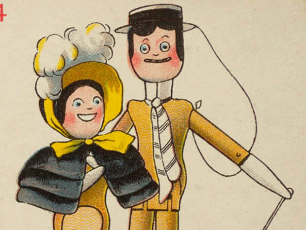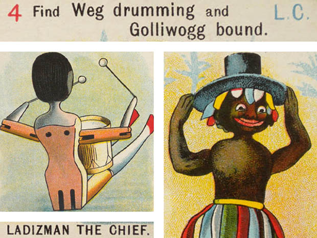 ロンドンで1821年にThomas De La Rue(トーマス・デ・ラ・ルー)が創設したバンヒル・ロウ通りにあるトーマス・デ・ラ・ルー社が、おそらく1900年代に製造した厚紙製のゴリウォーグ&ペグドール・ゲームカード6セットです。トーマス・デ・ラ・ルー社は麦わら帽子製造から創業したようですが、1831年には製造したトランプがイギリス王室御用達となり1855年からは切手の印刷を開始して1860年からは紙幣の印刷も始め会社は大きく発展したようです。Golliwogg(ゴリウォーグ)のキャラクターは、1873年にニューヨークで生まれたイギリス人の画家のフローレンス・ケイト・アプトンが「二つのオランダ人形(ペグドール)とゴリウォーグの冒険」という絵本で制作したもののようです。また、Peg Doll(ペグドール)の名前はClothespeg(クロスペグ/洗濯バサミ)のペグから付けられたようです。また、初期の頃のペグドールは木製の洗濯バサミの側面に穴を空けて腕になる木の棒を差し込んだだけのものでしたが、その後にお顔の彩色がされ腕や脚はジョイントで動かせるようになったようです。また、ペグドールは衣服を着せられていない状態で販売されていたようなのでチャイルド達は布切れから自分でドレスを作ったようです。また、ペグドールはPenny Doll(ペニードール)とも呼ばれていますが、これは1ポンドの100分の1のペニー(1セント)の価格のドールのことのようです。また、ペグドールは当時は高価なビスクドールが買えない庶民のチャイルド達のドールでしたが、今では世界中で人気が高くてとても高価なドールになっているようです。こちらは超レアなGolliwogg A Round Game(ゴリウォーグ・アラウンドゲーム)というゲームカードの6枚セットですが、ゲームはおそらく全部で48枚あるカードを4人位のチャイルド達に5枚位を初めに配ってから残りの裏返しされたカードを順番に1枚ずつ引いていってL. C.(Lead Card/リードカード)に書かれた指示に従って3枚セットの他の2枚のカードを探すというゲームのようです。また、一番多くのセットを集めた人が勝者のようです。また、No.4のリードカードにはFind Weg drumming and Golliwogg bound(ドラムを叩いているウェグと縛られたゴリウォーグを探してください) L. C.とLadizman the Chief(ラディズマン酋長)の表示とジャングルの中で黒いシルクハットをかぶってご満悦なラディズマン酋長のイラストがデザインされています。また、他のカードはWeg drumming(ドラムを叩いているウェグ)の表示と楽しそうにドラムを叩いているペグドールのウェグとGolliwogg Bound(縛られたゴリウォーグ)の表示とジャングルでロープで縛られて悲しそうに涙を流しているゴリウォーグのイラストがデザインされていてとても素敵です。また、No.14のリードカードにはFind Weg and Meg and Sarah's Motor Costume(ウェグとメグとサラの自動車に乗るための服装を探してください) L. C.とGolly's Motor(ゴリウォーグの自動車)の表示と最新型の自動車の横でグリーンの帽子をかぶってグリーンのコートを着て得意そうに立っているゴリウォーグのイラストがデザインされています。また、他のカードはWeg and Meg(ウェグとメグ)の表示とゴリウォーグの自動車に乗せてもらうのに白い羽飾りの付いたイエローのボンネットをかぶって黒いケープを着たウェグとオシャレな帽子にネクタイをして傘を持ったメグとSarah's Motor Costume(サラの自動車に乗るための服装)の表示と水色に白い星模様のワンピースにブルーの帽子とフードの付いたコートを着て自動車に乗ろうとしているペグドールのサラ・ジェーンのイラストがデザインされていますがどれもオシャレで可愛くてとてもいい感じです。また、裏面には白地に赤の幾何学模様がデザインされています。また、イラストは高価な全て特色を使った石版印刷で刷られているので何年経っても発色がよくて素晴らしいですね。120年も前のゴリウォーグとペグドールのゲームカードですが、見ているだけでゴリウォーグドールとペグドールが欲しくなってしまいそうなイギリス王室御用達のトーマス・デ・ラ・ルー社の大変価値ある一品です。