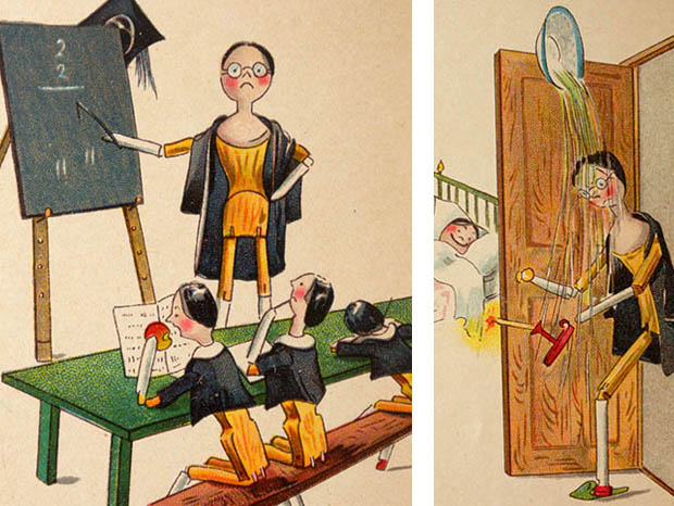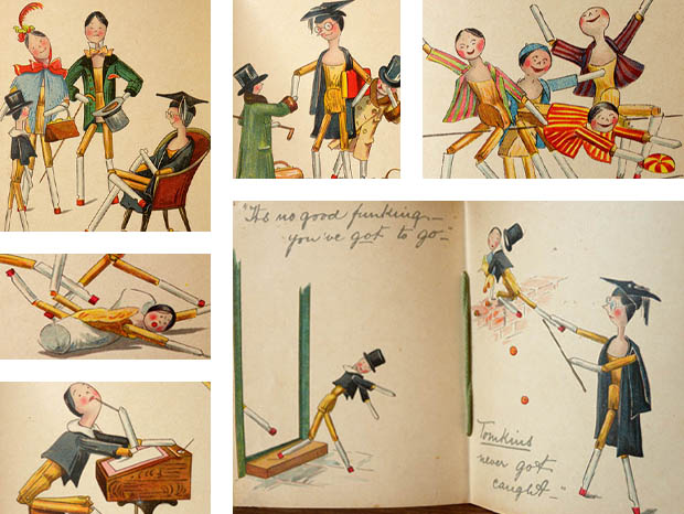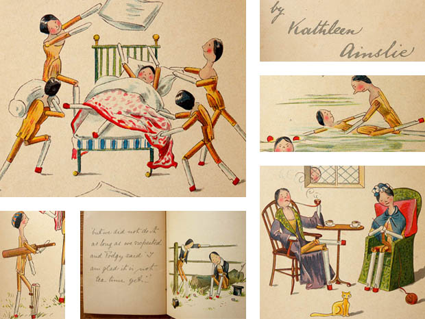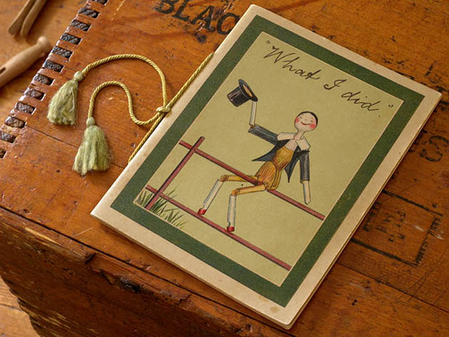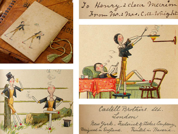 イギリスのロンドンにあるCastell Brothers Ltd.(キャステル・ブラザーズ出版社)とアメリカのニューヨークにあるFrederick A. Stokes Company(フレデリック・アボット・ストークス出版社)がおそらく1900年代に同時に出版したほとんどデッドストックの厚紙製のホワット・アイ・ディッド・ペグドールピクチャーブックです。Peg Doll(ペグドール)はイタリアの南チロル地方のヴァル・ガルデーナの町で作られた木製のドールが始まりのようですが、その後ドイツやオランダやアメリカで多く製作されたようです。また、Peg Doll(ペグドール)の名前はClothespeg(クロスペグ/洗濯バサミ)のペグから付けられたようです。また、初期の頃のペグドールは木製の洗濯バサミの側面に穴を空けて腕になる木の棒を差し込んだだけのものでしたが、その後にお顔の彩色がされ腕や脚はジョイントで動かせるようになったようです。また、ペグドールは衣服を着せられていない状態で販売されていたようなのでチャイルド達は布切れから自分でドレスを作ったようです。また、ペグドールはPenny Doll(ペニードール)とも呼ばれていますが、これは1ポンドの100分の1のペニー(1セント)の価格のドールのことのようです。また、ペグドールは当時は高価なビスクドールが買えない庶民のチャイルド達のドールでしたが、今では世界中で人気が高くてとても高価なドールになっているようです。こちらは超激レアなペグドール達がデザインされたPicture Book(ピクチャーブック/絵本)で、本体は表紙を入れて全部で36ページあり中ページは文章とカラーイラストが17点でモノクロイラストが1点あります。また、本体は淡いモスグリーンのシルクのフリンジのある紐で中綴じされているのも素敵です。また、モスグリーンの表紙にはWhat I did(私がやったこと)のタイトルと野原の柵の上に座ってシルクハットを手に持って白い襟の黒の学生服を着たボーイペグドール、裏表紙には教科書を投げて遊んでいる二人のボーイペグドール達のイラストがデザインされていています。また、中ページの最初には"What I did", by Kathleen Ainslie(キャスリーン・エインズリー作) Castell Brothers Ltd. London(ロンドンにあるキャステル・ブラザーズ出版社) New York, Frederick A. Stokes Company(ニューヨークにあるフレデリック・アボット・ストークス出版社) Designed in England(イギリスでデザイン) Printed in Bavaria(ドイツのバイエルンで印刷)の表示があります。また、1858年にイギリスのサマセット州のコーフの町で生まれたキャスリーン・エインズリーは、1900年から1911年頃に活躍したイラストレーターのようです。また、彼女は19世紀から20世紀初頭にかけて人気があったジョイント式のペグドールを題材にした絵本の出版で有名なようです。また、1878年に創設されたキャステル・ブラザーズ出版社は、バレンタインカードやクリスマスカードの出版で有名なようです。また、フレデリック・アボット・ストークス出版社は、1881年にフレデリック・アボット・ストークスが創設していますが、1939年までの58年間で3,000冊以上の書籍を出版しているよです。また、手書きでto Henry & Clecir Mcrion from Mr. & Mrs. C, CL. Wrightと書かれているようなのでライト夫妻がヘンリーとクレシル・マクリオンちゃんへ贈ったピクチャーブックのようです。また、その次のページからは、I heard ma and pa say "That boy’s got to go to school"(ママとパパが「あの子は学校に行かなきゃ」と言っているのが聞こえた) You bet, ma bought me a new hat old goggles is a guy!(もちろんだよ、ママが新しい帽子を買ってくれた。オールドゴーグルはとてもいいやつだ)の文章と椅子に座ってタバコを吸っているパパと編み物をしているママを窓から見ているボーイペグドールのイラストとパパとママといっしょに新しい帽子をかぶって入学する全寮制の男子学校のオールドゴーグル(古メガネ)というニックネームの先生にご挨拶しているボーイペグドールのイラストがデザインされていますが、お話は寮のベッドで就寝時間が過ぎても枕を投げて遊んでいる学生のペクドール達を懲らしめているオールドゴーグル先生、授業中に退屈そうにリンゴを食べているボーイペグドール、就寝時間にキャンドルホルダーを持って見回りに来たオールドゴーグル先生にドアの上に仕掛けた洗面器で水をかけて喜んでいるボーイペグドール達、トムキンスというベッドでタバコをふかしている先輩に寮の部屋のキャンドルでフライパンに入ったソーセージを焼かされているボーイペグドールなどの楽しい学校生活の様子が書かれていますが、この後ペグドール達はどうなってしまうのでしょうか。また、イラストは高価な全て特色を使った石版印刷で刷られているので何年経っても発色がよくて素晴らしいですね。また、こんなに状態がいいほとんどデッドストックの美品のペグドールのピクチャーブックは、この機会を逃すと滅多にお目にかかれないですね。120年も前のペグドールのピクチャーブックですが、見
