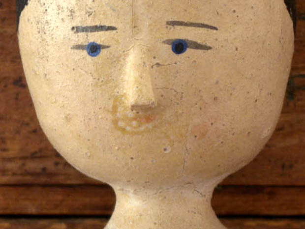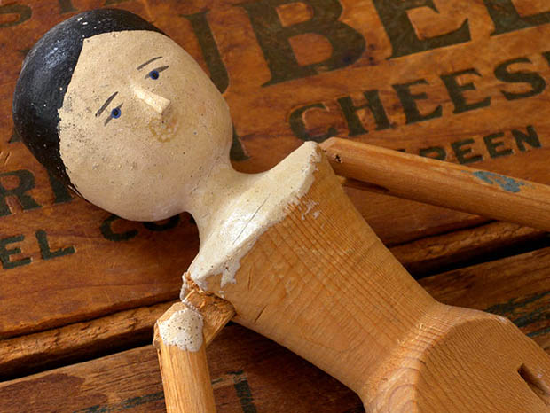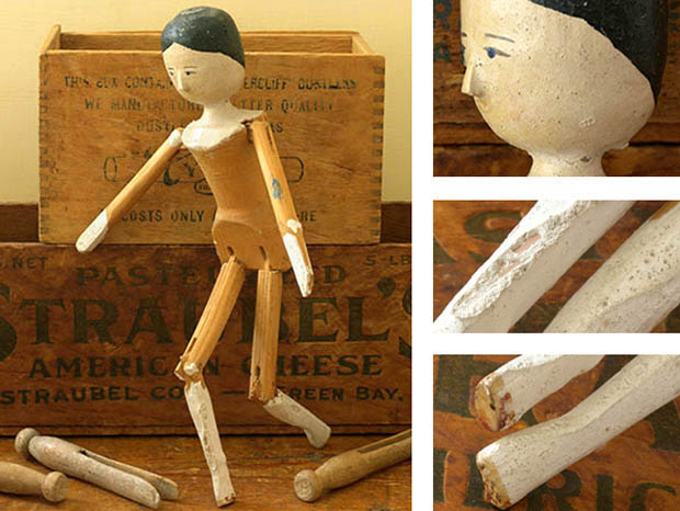 イギリスでおそらく1900年代に製作されたウッデン(木)製のリトルガール・ウッデンペグドールです。Peg Doll(ペグドール)はイタリアの南チロル地方のヴァル・ガルデーナの町で作られた木製のドールが始まりのようですが、その後ドイツやオランダやアメリカで多く製作されたようです。また、Peg Doll(ペグドール)の名前はClothespeg(クロスペグ/洗濯バサミ)のペグから付けられたようです。また、初期の頃のペグドールは木製の洗濯バサミの側面に穴を空けて腕になる木の棒を差し込んだだけのものでしたが、その後にお顔の彩色がされ腕や脚はジョイントで動かせるようになったようです。また、ペグドールは衣服を着せられていない状態で販売されていたようなのでチャイルド達は布切れから自分でドレスを作ったようです。また、ペグドールはPenny Doll(ペニードール)とも呼ばれていますが、これは1ポンドの100分の1のペニー(1セント)の価格のドールのことのようです。また、ペグドールは当時は高価なビスクドールが買えない庶民のチャイルド達のドールでしたが、今では世界中で人気が高くてとても高価なドールになっているようです。こちらは超レアな少し小振の幼いリトルガールのペグドールで、彩色された黒髪とつぶらな黒とブルーの瞳と少し大きめのお鼻の下のピンクの小さなお口で優しく微笑んでいるような表情がオシャレで可愛くてとてもいい感じです。また、首と胸元も肌色で彩色されていて肘から下の腕と膝から下の脚はホワイトで彩色されていますが、その他は彩色されていなく飴色になった木肌がとてもいいですね。また、足の先端はピンクの靴を履いているように彩色されています。また、頭は固定されていて胴体と腕と脚と膝が全て木材でジョイントされているのでいろんなポーズが楽しめるのが嬉しいです。ペグドールは衣服を着せられていない状態で販売されていたので可愛いドレスを作ってあげても楽しいですね。優しそうなつぶらな黒い瞳に見つめられているだけでどんどんとペグドールの世界へ引きずり込まれて行ってしまいそうな超レアな大変価値ある一品です。