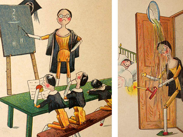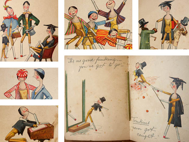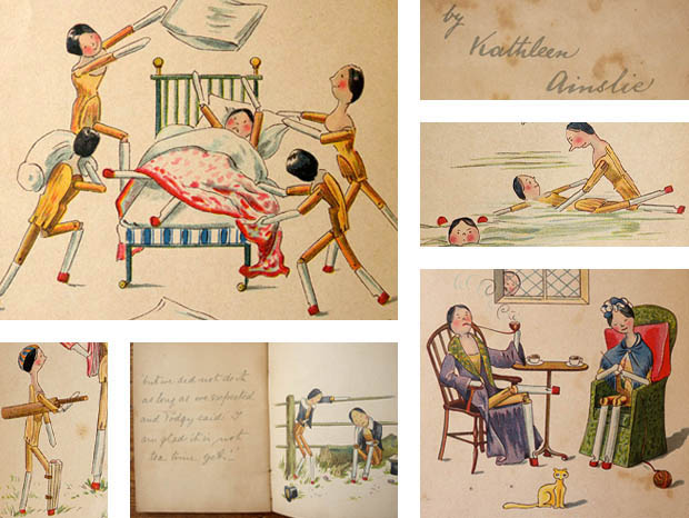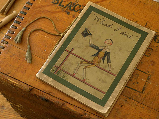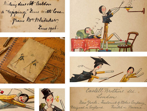 イギリスのロンドンにあるCastell Brothers Ltd.(キャステル・ブラザーズ出版社)とアメリカのニューヨークにあるFrederick A. Stokes Company(フレデリック・アボット・ストークス出版社)がおそらく1900年代に同時に出版したの厚紙製のホワット・アイ・ディッド・ペグドールピクチャーブックです。Peg Doll(ペグドール)はイタリアの南チロル地方のヴァル・ガルデーナの町で作られた木製のドールが始まりのようですが、その後ドイツやオランダやアメリカで多く製作されたようです。また、Peg Doll(ペグドール)の名前はClothespeg(クロスペグ/洗濯バサミ)のペグから付けられたようです。また、初期の頃のペグドールは木製の洗濯バサミの側面に穴を空けて腕になる木の棒を差し込んだだけのものでしたが、その後にお顔の彩色がされ腕や脚はジョイントで動かせるようになったようです。また、ペグドールは衣服を着せられていない状態で販売されていたようなのでチャイルド達は布切れから自分でドレスを作ったようです。また、ペグドールはPenny Doll(ペニードール)とも呼ばれていますが、これは1ポンドの100分の1のペニー(1セント)の価格のドールのことのようです。また、ペグドールは当時は高価なビスクドールが買えない庶民のチャイルド達のドールでしたが、今では世界中で人気が高くてとても高価なドールになっているようです。こちらは超激レアなペグドール達がデザインされたPicture Book(ピクチャーブック/絵本)で、本体は表紙を入れて全部で36ページあり中ページは文章とカラーイラストが17点でモノクロイラストが1点あります。また、本体は淡いモスグリーンのシルクのフリンジのある紐で中綴じされているのも素敵です。また、モスグリーンの表紙にはWhat I did(私がやったこと)のタイトルと野原の柵の上に座ってシルクハットを手に持って白い襟の黒の学生服を着たボーイペグドール、裏表紙には教科書を投げて遊んでいる二人のボーイペグドール達のイラストがデザインされていています。表紙の裏面にはNisheiy dear B H Ceshdou a "ripping" Xms with love. from Jnr. Nhilecher. Xms 1906と手書きで書かれていて、判読しづらいですが、おそらく「ニシェイ、親愛なるB H セシュドゥへ、愛を込めた「素敵な」クリスマスプレゼント。ジュニア・ニレチャーより。1906年のクリスマス 」などと書かれているようです。また、中ページの最初には"What I did", by Kathleen Ainslie(キャスリーン・エインズリー作) Castell Brothers Ltd. London(ロンドンにあるキャステル・ブラザーズ出版社) New York, Frederick A. Stokes Company(ニューヨークにあるフレデリック・アボット・ストークス出版社) Designed in England(イギリスでデザイン) Printed in Bavaria(ドイツのバイエルンで印刷)の表示があります。また、1858年にイギリスのサマセット州のコーフの町で生まれたキャスリーン・エインズリーは、1900年から1911年頃に活躍したイラストレーターのようです。また、彼女は19世紀から20世紀初頭にかけて人気があったジョイント式のペグドールを題材にした絵本の出版で有名なようです。また、1878年に創設されたキャステル・ブラザーズ出版社は、バレンタインカードやクリスマスカードの出版で有名なようです。また、フレデリック・アボット・ストークス出版社は、1881年にフレデリック・アボット・ストークスが創設していますが、1939年までの58年間で3,000冊以上の書籍を出版しているよです。また、手書きでto Henry & Clecir Mcrion from Mr. & Mrs. C, CL. Wrightと書かれているようなのでライト夫妻がヘンリーとクレシル・マクリオンちゃんへ贈ったピクチャーブックのようです。また、その次のページからは、I heard ma and pa say "That boy’s got to go to school"(ママとパパが「あの子は学校に行かなきゃ」と言っているのが聞こえた) You bet, ma bought me a new hat old goggles is a guy!(もちろんだよ、ママが新しい帽子を買ってくれた。オールドゴーグルはとてもいいやつだ)の文章と椅子に座ってタバコを吸っているパパと編み物をしているママを窓から見ているボーイペグドールのイラストとパパとママといっしょに新しい帽子をかぶって入学する全寮制の男子学校のオールドゴーグル(古メガネ)というニックネームの先生にご挨拶しているボーイペグドールのイラストがデザインされていますが、お話は寮のベッドで就寝時間が過ぎても枕を投げて遊んでいる学生のペクドール達を懲らしめているオールドゴーグル先生、授業中に退屈そうにリンゴを食べているボーイペグドール、就寝時間にキャンドルホルダーを持って見回りに来たオールドゴーグル先生にドアの上に仕掛けた洗面器で水をかけて喜んでいるボーイペグドール達、トムキンスというベッドでタバコをふかしている先輩に寮の部屋のキャンドルでフライパンに入ったソーセージを焼かされているボーイペグドールなどの楽しい学校生活の様子が書かれていますが、この後ペグドール達はどうなってしまうのでしょうか。また、イラストは高価な全て特色を使っ