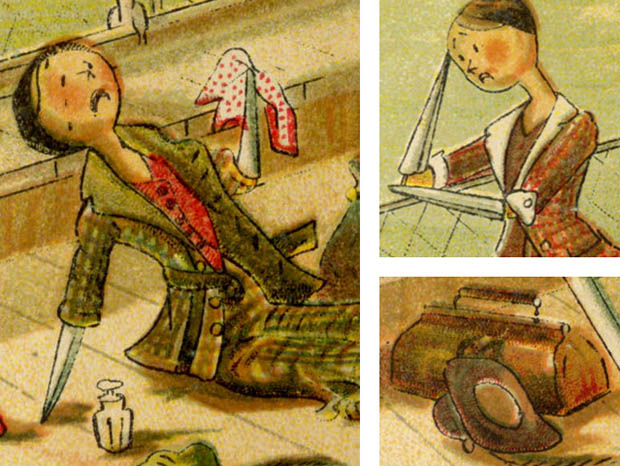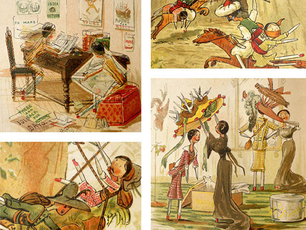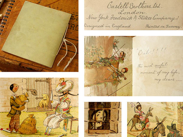 イギリスのロンドンにあるCastell Brothers Ltd.(キャステル・ブラザーズ出版社)とアメリカのニューヨークにあるFrederick A. Stokes Company(フレデリック・アボット・ストークス出版社)が1900年代に同時に出版した厚紙製のキャサリン・スーザン・アンド・ミー・ゴーズ・アブロード・ペグドールピクチャーブックです。Peg Doll(ペグドール)はイタリアの南チロル地方のヴァル・ガルデーナの町で作られた木製のドールが始まりのようですが、その後ドイツやオランダやアメリカで多く製作されたようです。また、Peg Doll(ペグドール)の名前はClothespeg(クロスペグ/洗濯バサミ)のペグから付けられたようです。また、初期の頃のペグドールは木製の洗濯バサミの側面に穴を空けて腕になる木の棒を差し込んだだけのものでしたが、その後にお顔の彩色がされ腕や脚はジョイントで動かせるようになったようです。また、ペグドールは衣服を着せられていない状態で販売されていたようなのでチャイルド達は布切れから自分でドレスを作ったようです。また、ペグドールはPenny Doll(ペニードール)とも呼ばれていますが、これは1ポンドの100分の1のペニー(1セント)の価格のドールのことのようです。また、ペグドールは当時は高価なビスクドールが買えない庶民のチャイルド達のドールでしたが、今では世界中で人気が高くてとても高価なドールになっているようです。こちらは超激レアなペグドール達がデザインされたPicture Book(ピクチャーブック/絵本)で、本体は表紙を入れて全部で28ページあり中ページは文章とカラーイラストが12点あります。また、本体はアイボリーホワイトのシルクのフリンジのある紐で中綴じされているのも素敵です。また、アイボリー表紙にはCatharine Susan and me goes abroad(キャサリン・スーザン・アンド・ミー・ゴーズ・アブロード/キャサリン・スーザンと私が海外へ行く)のタイトルとby Kathleen Ainslie(キャスリーン・エインズリー作)の表示とスイスの森の中で民族衣装を着た女性といっしょに肩を組んで微笑んでいるキャサリン・スーザンとマリアのイラストがデザインされていています。また、Catharine Susan and me goes abroad by Kathleen Ainslie, Castell Brothers Ltd. London(ロンドンにあるキャステル・ブラザーズ出版社) New York, Frederick A. Stokes Company(ニューヨークにあるフレデリック・アボット・ストークス出版社) Designed in England(イギリスでデザイン) Printed in Bavaria(ドイツのバイエルンで印刷)の表示があります。また、1858年にイギリスのサマセット州のコーフの町で生まれたキャスリーン・エインズリーは、1900年から1911年頃に活躍したイラストレーターのようです。また、彼女は19世紀から20世紀初頭にかけて人気があったジョイント式のペグドールを題材にした絵本の出版で有名なようです。また、1878年に創設されたキャステル・ブラザーズ出版社は、バレンタインカードやクリスマスカードの出版で有名なようです。また、フレデリック・アボット・ストークス出版社は、1881年にフレデリック・アボット・ストークスが創設していますが、1939年までの58年間で3,000冊以上の書籍を出版しているよです。また、その次のページからは、Other people go abroad so why not us?(他の人は海外に行くのに、なぜ私たちは行かないのでしょうか) 、Never again, Maria! no never!!! I shall come home by airship(もう二度としないよ、マリア、絶対にしないよ。私は飛行船で家に帰ります)、They will expect us to bring home the latest so along a Paree!(彼らは私たちがパリの最新のものを家に持ち帰ることを期待しています)、Switzerland at last! Excelsior!(ついにスイスへ、高いよ)、Ciel!!!! the most awful moment of my life, my dears(空だ。親愛なる皆さん、私の人生で最も恐ろしい瞬間です)の文章とお部屋でガイドブックを読んだり地図を見て旅行の計画を立てているキャサリン・スーザンとマリアのイラストがデザインされていますが、お話はイギリスから船に乗ってフランスへと旅行に出ますが、船酔いをして飛行船で家に帰りたいと嘆いているキャサリン・スーザンとマリアですが、パリでは最新流行のシャポー(帽子)を試着して喜んでいるキャサリン・スーザンとマリアがいます。また、スイスでは山登りをして崖から落ちそうになって焦っているキャサリン・スーザンとマリアがいます。また、ドイツでは美味しいソーセージとビールを味わってベルリンでは軍事パレードを見学します。また、その後にロバに乗って峠を超えて南の方へと向かう途中で二人は山賊に拐われてしまいますが、この後キャサリン・スーザンとマリアのペグドール達はどうなってしまうのでしょうか。また、沢山のイラストがデザインされていますが、どれもオシャレで可愛くてとてもいい感じです。また、イラストは高価な全て特色を使った石版印刷で刷られているので何年経っても発色が良くて素晴らしいですね。120年も前のペグドールのピクチャーブックですが、見ているだけでペグドールが欲しくなってしまいそうな超