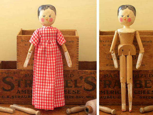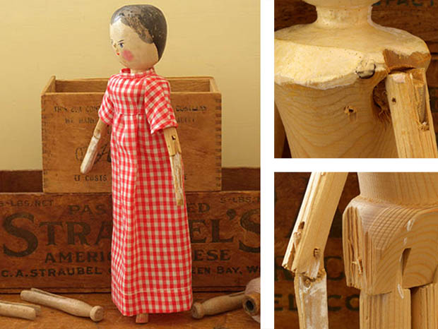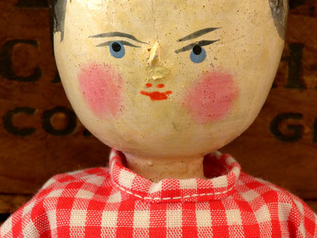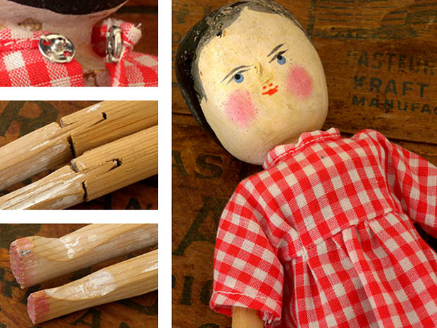 アメリカでおそらく1900年代に製作されたギンガムチェックの木綿のワンピースを着たウッデン(木)製のリトルガール・ウッデンペグドールです。Peg Doll(ペグドール)はイタリアの南チロル地方のヴァル・ガルデーナの町で作られた木製のドールが始まりのようですが、その後ドイツやオランダやアメリカで多く製作されたようです。また、Peg Doll(ペグドール)の名前はClothespeg(クロスペグ/洗濯バサミ)のペグから付けられたようです。また、初期の頃のペグドールは木製の洗濯バサミの側面に穴を空けて腕になる木の棒を差し込んだだけのものでしたが、その後にお顔の彩色がされ腕や脚はジョイントで動かせるようになったようです。また、ペグドールは衣服を着せられていない状態で販売されていたようなのでチャイルド達は布切れから自分でドレスを作ったようです。また、ペグドールはPenny Doll(ペニードール)とも呼ばれていますが、これは1ポンドの100分の1のペニー(1セント)の価格のドールのことのようです。また、ペグドールは当時は高価なビスクドールが買えない庶民のチャイルド達のドールでしたが、今では世界中で人気が高くてとても高価なドールになっているようです。こちらは超レアなレッドとホワイトのギンガムチェックのワンピースを着たリトルガールのペグドールで、彩色された黒髪と肌色に彩色されたお顔のつぶらな灰色がかったブルーの瞳と小さな赤い口元で優しく微笑んでいるような表情がオシャレで可愛くてとてもいい感じです。また、健康そうなピンクのほっぺも可愛いですが、小さなお鼻は彩色ではなく立体で作られています。また、首と胸元も肌色で彩色されていて肘から下の腕と膝から下の脚はホワイトで彩色されていますが、その他は彩色されていなく飴色になった木肌がとてもいいですね。また、頭は固定されていて胴体と腕と肘と脚と膝が全て木材でジョイントされているのでいろんなポーズが楽しめるのが嬉しいです。レッドとホワイトのギンガムチェックのワンピースを着た優しそうなつぶらな灰色がかったブルーの瞳のペグドールに見つめられているだけでどんどんとペグドールの世界へ引きずり込まれて行ってしまいそうな超レアな大変価値ある一品です。