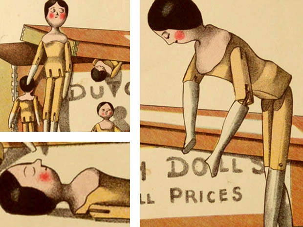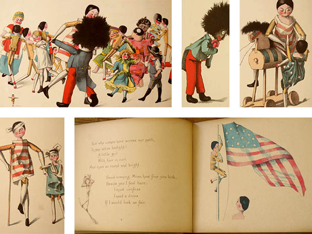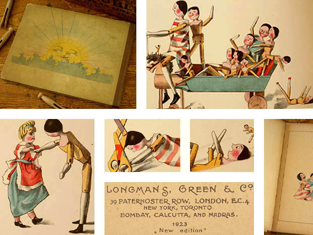 ロンドンで1724年にThomas Longman(トーマス・ロングマン)が創設したLongmans Green(ロングマンズ・グリーン)出版社が、1923年に出版した厚紙製のザ・アドベンチャーズ・オブ・トゥー・ダッチドールズ・アンド・ア・ゴリウォーグブックです。ロングマンズ・グリーン出版社は、アーサー・コナン・ドイルが書いた推理小説の「シャーロック・ホームズの冒険」の出版などで有名なようです。Peg Doll(ペグドール)はイタリアの南チロル地方のヴァル・ガルデーナの町で作られた木製のドールが始まりのようですが、その後ドイツやオランダやアメリカで多く製作されたようです。また、Peg Doll(ペグドール)の名前はClothespeg(クロスペグ/洗濯バサミ)のペグから付けられたようです。また、初期の頃のペグドールは木製の洗濯バサミの側面に穴を空けて腕になる木の棒を差し込んだだけのものでしたが、その後にお顔の彩色がされ腕や脚はジョイントで動かせるようになったようです。また、ペグドールは衣服を着せられていない状態で販売されていたようなのでチャイルド達は布切れから自分でドレスを作ったようです。また、ペグドールはPenny Doll(ペニードール)とも呼ばれていますが、これは1ポンドの100分の1のペニー(1セント)の価格のドールのことのようです。また、ペグドールは当時は高価なビスクドールが買えない庶民のチャイルド達のドールでしたが、今では世界中で人気が高くてとても高価なドールになっているようです。こちらは超激レアなペグドール達がデザインされたPicture Book(ピクチャーブック/絵本)で、本体は表紙を除いて64ページあり文章とカラーイラストが34点でモノクロイラストが26点あります。また、ブラウンの背貼りのアイボリーの表紙にはThe Adventures of two Dutch Dolls(ザ・アドベンチャーズ・オブ・トゥー・ダッチドールズ/二人のオランダ人形の冒険) by Florence K. Upton(フローレンス・ケイト・アプトン作) Words by Bertha Upton(バーサ・アプトンの文章) Longmans Green & Co., London & New York(ロンドンとニューヨーク)の表示と白と赤の横縞のワンピースを着たペグドールのペギーと首に蝶ネクタイをしてブルーのジャケットに赤いズボンを履いたゴリウォーグと水色に白い星模様のワンピースを着たペグドールのサラ・ジェーン達がお辞儀をしているイラストと裏表紙にはお日様のイラストがデザインされていています。また、イギリスから移民してきた両親の次女として1873年にニューヨークで生まれたフローレンス・ケイト・アプトンは、20歳の頃からロンドンで挿絵画家として活躍したようです。また、こちらの絵本の文章を書いたのはフローレンスの母親のバーサ・アプトンのようです。また、中ページの1ページには、The Adventures of two Dutch Dolls and a Golliwogg(ザ・アドベンチャーズ・オブ・トゥー・ダッチドールズ・アンド・ア・ゴリウォーグ/二人のオランダ人形とゴリウォーグの冒険) Picture by Florence K. Upton, Words by Bertha Upton, Longmans Green & Co., 39 Paternoster Row, London(ロンドンのパターノスター・ロウ通り39 番地), E. C. 4, New York, Toronto, Mombay, Calcutta, and Madras. (ニューヨーク、トロント、モンベイ、カルカッタ、マドラス) 1923 " New edition"(1923年の新版)の表示があります。また、2ページからはT was on a frosty Christmas Eve when Peggy Deutchland woke from her wooden sleep on the counter steep and to her neighbour spoke. Get up! get up. dear Sarah Jane! Now strike the midnight hour, when dolls and toys taste human joys, and revel in their power(凍えるようなクリスマスイブの夜、ペギー・ドイチェランドはカウンターの上で眠りから目覚め、隣人に話しかけました。起きなさい、起きなさい。愛しいサラ・ジェーン、さあ、真夜中の鐘を鳴らしなさい。人形やおもちゃが人間の喜びを味わい、その力に浸る時よ)の文章と玩具の紙箱から出てきたペグドールのペギーがサラ・ジェーンを起こしているイラストがデザインされています。また、お話は、真夜中のクリスマスイブのおもちゃ屋でおもちゃ達は生き返り遊び始めます。ペギーとサラ・ジェーンはアメリカの星条旗を使って衣装を作り始めす。また、ペグドール達は木馬に乗ったりびっくり箱を開けたりビスクドールにお辞儀したりして楽しそうに遊んでいますが、ダンスの準備をしていると、真っ黒な人がいるので恐怖に駆られてしまいますが、彼は優しい微笑みを浮かべながら、ゴリウォーグと名乗りました。そしてみんなは楽しそうにダンスをしますが、この後ペグドール達はどうなってしまうのでしょうか。また、沢山のイラストがデザインされていますが、どれもオシャレで可愛くてとてもいい感じです。また、イラストは高価な全て特色を使った石版印刷で刷られているので何年経っても発色が良くて素晴らしいですね。102年も前のペグドールのピクチャーブックですが、見ているだけでペグドールが欲しくなってしまいそうな超激レアな大変価値ある一品です。