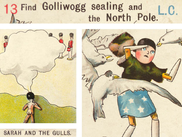 ロンドンで1821年にThomas De La Rue(トーマス・デ・ラ・ルー)が創設したバンヒル・ロウ通りにあるトーマス・デ・ラ・ルー社が、おそらく1900年代に製造した厚紙製のゴリウォーグ&ペグドール・ゲームカード6セットです。トーマス・デ・ラ・ルー社は麦わら帽子製造から創業したようですが、1831年には製造したトランプがイギリス王室御用達となり1855年からは切手の印刷を開始して1860年からは紙幣の印刷も始め会社は大きく発展したようです。Golliwogg(ゴリウォーグ)のキャラクターは、1873年にニューヨークで生まれたイギリス人の画家のフローレンス・ケイト・アプトンが「二つのオランダ人形(ペグドール)とゴリウォーグの冒険」という絵本で制作したもののようです。また、Peg Doll(ペグドール)の名前はClothespeg(クロスペグ/洗濯バサミ)のペグから付けられたようです。また、初期の頃のペグドールは木製の洗濯バサミの側面に穴を空けて腕になる木の棒を差し込んだだけのものでしたが、その後にお顔の彩色がされ腕や脚はジョイントで動かせるようになったようです。また、ペグドールは衣服を着せられていない状態で販売されていたようなのでチャイルド達は布切れから自分でドレスを作ったようです。また、ペグドールはPenny Doll(ペニードール)とも呼ばれていますが、これは1ポンドの100分の1のペニー(1セント)の価格のドールのことのようです。また、ペグドールは当時は高価なビスクドールが買えない庶民のチャイルド達のドールでしたが、今では世界中で人気が高くてとても高価なドールになっているようです。こちらは超レアなGolliwogg A Round Game(ゴリウォーグ・アラウンドゲーム)というゲームカードの6枚セットですが、ゲームはおそらく全部で48枚あるカードを4人位のチャイルド達に5枚位を初めに配ってから残りの裏返しされたカードを順番に1枚ずつ引いていってL. C.(Lead Card/リードカード)に書かれた指示に従って3枚セットの他の2枚のカードを探すというゲームのようです。また、一番多くのセットを集めた人が勝者のようです。また、No.10のリードカードにはFind Flag of Truce and Midget firing(休戦旗と発砲した小さな人形を探してください) L. C.とThe Enemy(敵)の表示と黒い帽子をかぶって赤と白の軍服を着た敵軍の兵士のイラストがデザインされています。また、他のカードはFlag of Truce(休戦旗)の表示とPeace(平和)と書かれた白旗を振っている赤と水色の軍服を着た兵士のペグドールとMidget Firing(射撃中の小さな人)の表示と黒い帽子をかぶって赤と白の軍服を着た敵軍の兵隊を射撃している小さなペグドールのイラストがデザインされていてとても素敵です。また、No.13のリードカードにはFind Golliwogg sealing and the North Pole(ゴリウォーグのアザラシと北極を探してください) L. C.とSarah and the Gulls(サラとカモメ達)の表示とカモメ達に傍に寄られて困っている毛皮の帽子をかぶって水色に白い星模様のワンピースに黒いセーターを着たペグドールのサラ・ジェーンのイラストがデザインされています。また、他のカードはGolliwogg sealing(ゴリウォーグのアザラシ狩り)の表示と割れそうな氷の上から銛(もり)でアザラシ狩りをしている暖かそうな毛皮の服を着たゴリウォーグとThe North Pole(北極)の表示と北極に立っている白いポールに取り付けられたThis Pole has been Discovered by Golliwogg Peggy Sarah Jane Meg & WEg & the Midget(この北極はゴリウォーグ、ペギー 、サラ・ジェーン、メグとウェグと小さな人によって発見されました)と書かれた看板と黒のペンキと筆のイラストがデザインされていますがどれもオシャレで可愛くてとてもいい感じです。また、裏面には白地に赤の幾何学模様がデザインされています。また、イラストは高価な全て特色を使った石版印刷で刷られているので何年経っても発色がよくて素晴らしいですね。120年も前のゴリウォーグとペグドールのゲームカードですが、見ているだけでゴリウォーグドールとペグドールが欲しくなってしまいそうなイギリス王室御用達のトーマス・デ・ラ・ルー社の大変価値ある一品です。