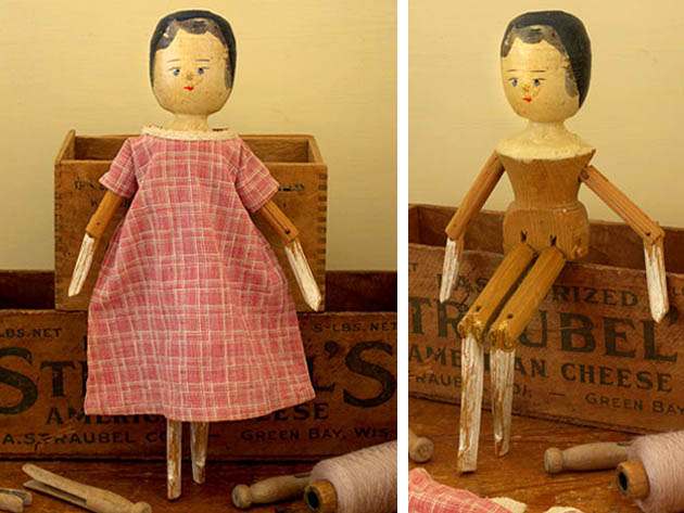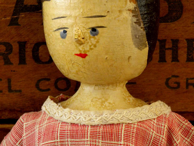 アメリカでおそらく1900年代に製作されたギンガムチェックの木綿のワンピースを着たウッデン(木)製のリトルガール・ウッデンペグドールです。Peg Doll(ペグドール)はイタリアの南チロル地方のヴァル・ガルデーナの町で作られた木製のドールが始まりのようですが、その後ドイツやオランダやアメリカで多く製作されたようです。また、Peg Doll(ペグドール)の名前はClothespeg(クロスペグ/洗濯バサミ)のペグから付けられたようです。また、初期の頃のペグドールは木製の洗濯バサミの側面に穴を空けて腕になる木の棒を差し込んだだけのものでしたが、その後にお顔の彩色がされ腕や脚はジョイントで動かせるようになったようです。また、ペグドールは衣服を着せられていない状態で販売されていたようなのでチャイルド達は布切れから自分でドレスを作ったようです。また、ペグドールはPenny Doll(ペニードール)とも呼ばれていますが、これは1ポンドの100分の1のペニー(1セント)の価格のドールのことのようです。また、ペグドールは当時は高価なビスクドールが買えない庶民のチャイルド達のドールでしたが、今では世界中で人気が高くてとても高価なドールになっているようです。こちらは超レアなピンクとホワイトのチェックのワンピースを着たリトルガールのペグドールで、彩色された黒髪と肌色に彩色されたお顔のつぶらな灰色がかったブルーの瞳と小さな赤い口元で優しく微笑んでいるような表情がオシャレで可愛くてとてもいい感じです。また、ワンピースの襟ぐりに付けられたアイボリーのアラベスク模様のリボン飾りもオシャレですね。また、小さなお鼻は彩色ではなく立体で作られているのも可愛いですね。また、首と胸元も肌色で彩色されていて肘から下の腕と膝から下の脚はホワイトで彩色されていますが、その他は彩色されていなく飴色になった木肌がとてもいいですね。また、頭は固定されていて胴体と腕と肘と脚と膝が全て木材でジョイントされているのでいろんなポーズが楽しめるのが嬉しいです。ピンクとホワイトのギンガムチェックのワンピースを着た優しそうなつぶらな灰色がかったブルーの瞳のペグドールに見つめられているだけでどんどんとペグドールの世界へ引きずり込まれて行ってしまいそうな超レアな大変価値ある一品です。