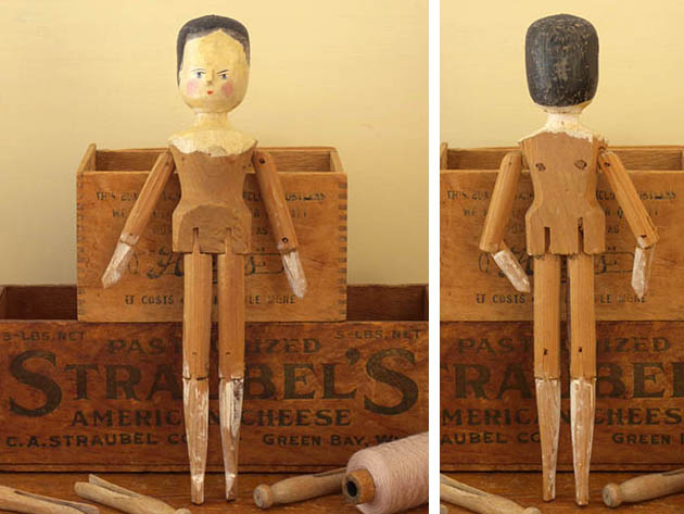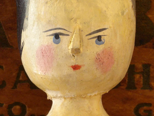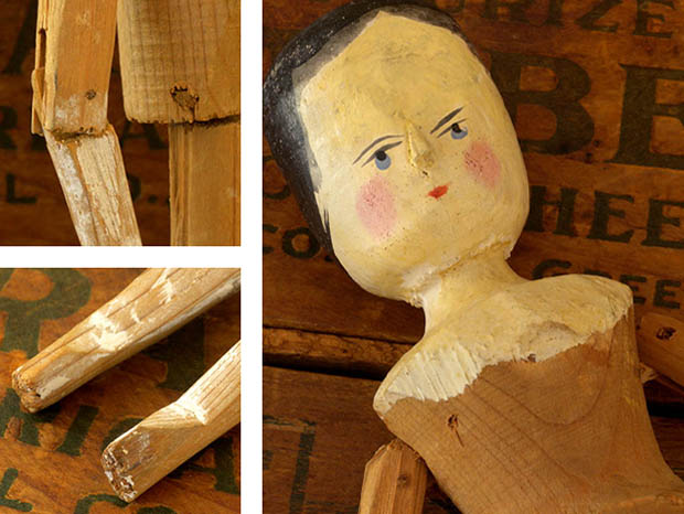 アメリカでおそらく1900年代に製作されたウッデン(木)製のリトルガール・ウッデンペグドールです。Peg Doll(ペグドール)はイタリアの南チロル地方のヴァル・ガルデーナの町で作られた木製のドールが始まりのようですが、その後ドイツやオランダやアメリカで多く製作されたようです。また、Peg Doll(ペグドール)の名前はClothespeg(クロスペグ/洗濯バサミ)のペグから付けられたようです。また、初期の頃のペグドールは木製の洗濯バサミの側面に穴を空けて腕になる木の棒を差し込んだだけのものでしたが、その後にお顔の彩色がされ腕や脚はジョイントで動かせるようになったようです。また、ペグドールは衣服を着せられていない状態で販売されていたようなのでチャイルド達は布切れから自分でドレスを作ったようです。また、ペグドールはPenny Doll(ペニードール)とも呼ばれていますが、これは1ポンドの100分の1のペニー(1セント)の価格のドールのことのようです。また、ペグドールは当時は高価なビスクドールが買えない庶民のチャイルド達のドールでしたが、今では世界中で人気が高くてとても高価なドールになっているようです。こちらは超レアなリトルガールのペグドールで、彩色された黒髪と肌色に彩色されたお顔のつぶらな灰色がかったブルーの瞳と小さな赤い口元で優しく微笑んでいるような表情がオシャレで可愛くてとてもいい感じです。また、健康そうなピンクのほっぺも可愛いですが、小さなお鼻は彩色ではなく立体で作られています。また、首と胸元も肌色で彩色されていて肘から下の腕と膝から下の脚はホワイトで彩色されていますが、その他は彩色されていなく飴色になった木肌がとてもいいですね。また、足の先端はピンクの靴を履いているように彩色されています。また、頭は固定されていて胴体と腕と肘と脚と膝が全て木材でジョイントされているのでいろんなポーズが楽しめるのが嬉しいです。ペグドールは衣服を着せられていない状態で販売されていたので可愛いドレスを作ってあげても楽しいですね。優しそうなつぶらな灰色がかったブルーの瞳に見つめられているだけでどんどんとペグドールの世界へ引きずり込まれて行ってしまいそうな超レアな大変価値ある一品です。