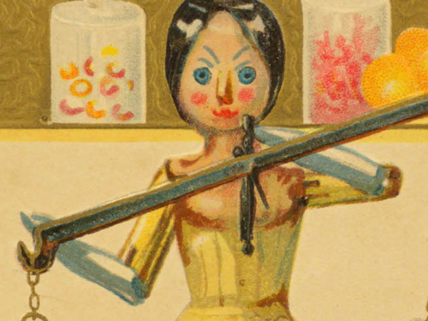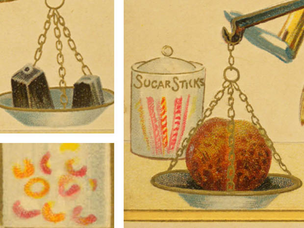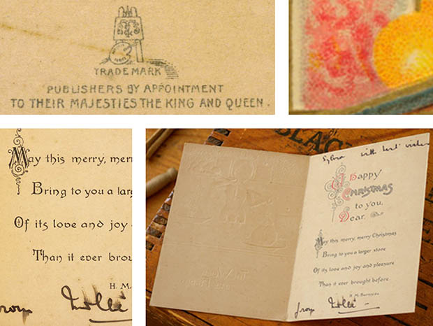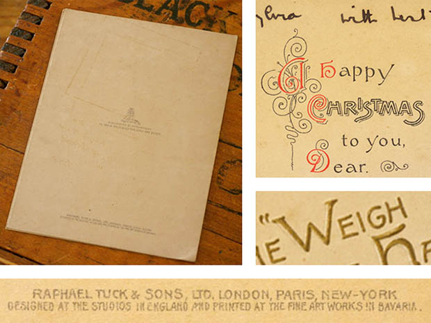 イギリスのロンドンで1866年にラファエル・タックが妻と創設したRaphael Tuck & Sons(ラファエルタック&サンズ)社が、おそらく1900年代に製作した厚紙製のガールペグドール・イン・ザ・キッチン・クリスマスカードです。ラファエルタック&サンズ社はポストカードの製造販売で有名なようです。Peg Doll(ペグドール)はイタリアの南チロル地方のヴァル・ガルデーナの町で作られた木製のドールが始まりのようですが、その後ドイツやオランダやアメリカで多く製作されたようです。また、Peg Doll(ペグドール)の名前はClothespeg(クロスペグ/洗濯バサミ)のペグから付けられたようです。また、初期の頃のペグドールは木製の洗濯バサミの側面に穴を空けて腕になる木の棒を差し込んだだけのものでしたが、その後にお顔の彩色がされ腕や脚はジョイントで動かせるようになったようです。また、ペグドールは衣服を着せられていない状態で販売されていたようなのでチャイルド達は布切れから自分でドレスを作ったようです。また、ペグドールはPenny Doll(ペニードール)とも呼ばれていますが、これは1ポンドの100分の1のペニー(1セント)の価格のドールのことのようです。また、ペグドールは当時は高価なビスクドールが買えない庶民のチャイルド達のドールでしたが、今では世界中で人気が高くてとても高価なドールになっているようです。こちらは超激レアなガールペグドールがデザインされた二つ折りのChristmas Card(クリスマスカード)で、表紙にはThe "Weigh" to be Happy(幸せになるための計量)の文字がゴールドのエンボスでデザインされていてとても素敵です。また、棚にお菓子の入ったキャニスターやフルーツが置かれたキッチンで、天秤ばかりで砂糖菓子の重さを量っているガールペグドールがデザインされていてオシャレで可愛くてとてもいい感じです。また、テーブルにはSucar Sncks(シュガースナック/砂糖菓子)と書かれたキャニスターが置かれているのもオシャレです。また、棚の背景はゴールドでデザインされていますが、イラストには全て立体的なエンボス加工がされていてとても凝った作りです。また、イラストを描いたのはKathleen Ainslie(キャスリーン・エインズリー)のようですが、1858年にイギリスのサマセット州のコーフの町で生まれたキャスリーン・エインズリーは、1900年から1911年頃に活躍したイラストレーターのようです。また、彼女は19世紀から20世紀初頭にかけて人気があったジョイント式のペグドールを題材にした絵本の出版で有名なようです。また、中面は美しい飾り罫のある文字でHappy Christmas to you, Dear(素敵なクリスマスを、愛しいあなたへ) May this merry, merry Christmas bring to you a larger store of its love and pleasure then if ever brouht before(このメリー・メリー・クリスマスが、かつてないほどの沢山の愛と喜びをもたらしますように) N. M. Burnside(バーンサイド)と書かれていてとても素敵です。また、手書きのメッセージもあります。また、裏表紙には、イーゼルとパレットのラファエル・タック&サンズ社のマークとPubulisher by Appointment to their majesties the King and Queen(国王陛下および王妃陛下御用達出版社) Raphael Tuck & Sons, Ltd. London, Paris, New-York(ラファエル・タック・アンド・サンズ社、ロンドン、パリ、ニューヨーク) Designed at the Studios in England and printed at the fine art works in Bavaria(イギリスのスタジオでデザインされてバイエルンのファインアートワークスで印刷されました)の表示があります。また、イラストは高価な全て特色を使った石版印刷で刷られているので何年経っても発色がよくて素晴らしいですね。120年以上も前のペグドールのクリスマスカードですが、見ているだけでペグドールが欲しくなってしまいそうな超激レアな大変価値ある一品です。