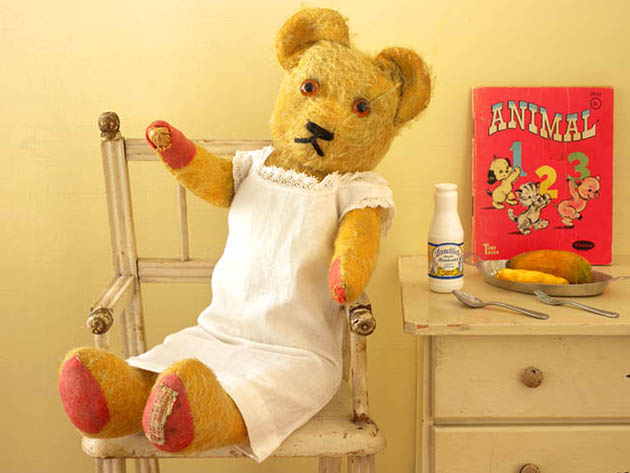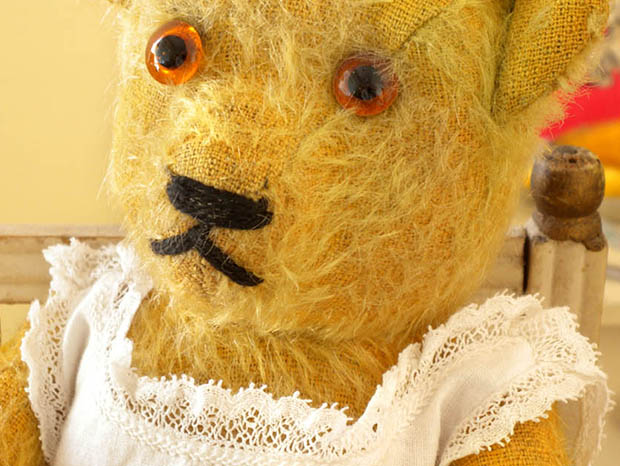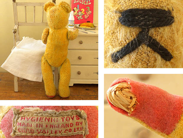 イギリスにあるChad Valley(チャドバレー)社が、おそらく1940年代の終わり頃に製造したスクイーカーが内蔵されたぬいぐるみのホワイトワンピース・ゴールデンモヘアベビーテディベアです。チャドバレー社は1800年代の初頭にイギリスのバーミンガムでアンソニー・ジョンソンが創業した印刷会社が始まりのようですが、息子のジョセフがバーミンガム郊外のチャドと呼ばれる川が流れる谷間へ会社を移転したことから社名をChad Valley(チャドバレー)と改称したようです。そして、1938年にはイギリス王室御用達のトイメーカーになったようなので当時のプリンセスやプリンス達はチャドバレー社の玩具で遊んでいたようです。また、イギリスではTeddy Bear(テディベア)はドイツから輸入していたようですが、1914年に第一次世界大戦が勃発するとテディベアの輸入ができなくなりテディベアはイギリスで独自に製造されるようになったようです。しかし、戦時中でモヘアなどの材料が不足していたのでイギリス製のテディベアはモヘアの生地の使用をどんどん少なくして製造していったので鼻が短いフラットフェイスのテディベアが特徴となったようです。こちらは超レアなゴールドのモヘアで作られたまだ小さなガールのテディベアで、襟ぐりと肩周りにレース飾りの付いたホワイトのワンピースを着てつぶらなダークブラウンと琥珀色のガラスの目と黒い糸でステッチされたお鼻の下のお口で優しく微笑んでいる姿がオシャレで可愛くてとてもいい感じです。また、ワンピースの両方の肩には小さなボタンとボタンループが付けられていますが、ボタンはとても小さいのに包みボタンでとても凝った作りです。また、襟ぐりの裏側には6の表示のある布タグがあります。また、頭と胴体と脚の中には木毛が詰められているので押すとザクザクした硬い感触があります。また、頭と胴体のジョイント部分には丸い板紙が取り付けられていて胴体と前脚と後脚は太い針金でジョイントされているのでいろんなポーズが楽しめます。また、前足と後ろ足にはライトブラウンのフェルトのパッドが縫い付けられているのもいいですね。また、材料が不足していた時代なので爪の刺繍は元からありません。また、左足のパッドには布タグが縫い付けられていてダークレッドでHygienic Toys(ハイジェニック・トイズ/衛生的な玩具) Made in England by Chad Valley Co. Ltd.(チャドバレー社の英国製)の表示がありますが、この時代のぬいぐるみで布タグがあるものはやはり超レアですね。また、1952年にエリザベス2世がイギリス女王に即位したことから1952年以降のチャドバレー社のぬいぐるみには、こちらの布タグ以外にThe Chad Valley Co. Ltd.とチャドバレー社の王冠とライオンのマークとby Appointment Toy Makers to H. M. Queen Elizabeth the Queen Mother(エリザベス女王陛下と皇太后から任命された玩具メーカー)の表示のある布タグもいっしょに付けられているようなのでこちらのテディベアは1952年以前に製造されたもののようです。また、お腹の中にはスクイーカーが内蔵されていますが、残念ながら現状では押してもキュンキュンと鳴きません。王室御用達の貫禄のあるホワイトワンピースを着たゴールデンモヘアのベビーテディベアですが、この子が傍にいるだけで気持ちが優しく癒されてしまいそうな大変可愛い一品です。