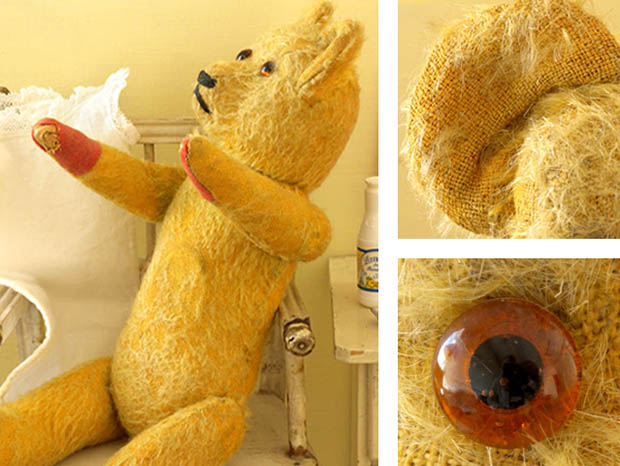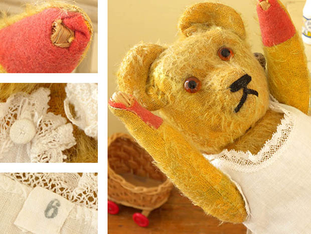 モヘアに少し抜けがありますが大変きれいです。ガラスの目にキズや欠けはなく大変きれいです。鼻とお口の刺繍に多少の傷みがありますが切れはなく大変きれいです。チャイルド達に沢山遊んでもらったので両方の前足のパッドに小さな破れがあり中の木毛が見えています。ジョイントに壊れはありません。スクイーカーは現状では押しても鳴きません。ワンピースはおそらく1930年代から1940年代のもので多少の傷みがありますがほつれや破れはなく大変きれいです。その他、多少の傷みや汚れなどありますがほつれや破れはなく美品で大変状態が良くきれいで、Good Conditionです。