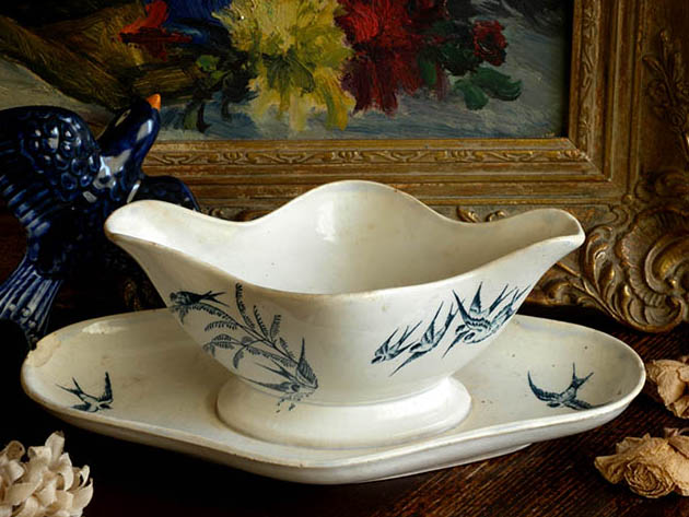 フランスでおそらく1890年から1910年代に製造されたGrigny(グリニー)のファイアンス(陶磁器)のブルーフォンセイロンデール・ファイアンスソーシエールです。リヨンから南へ20kmほど行ったローヌ川沿いのGrigny(グリニー)の町で、おそらく1830年代頃にDecaen(デカン)兄弟が陶器工場を創設したのがグリニーのファイアンスの始まりのようです。また、こちらのファイアンスはカオリンを混ぜて白くして耐久性を高めているようです。こちらは超レアなお料理のソースを入れるためのソーシエール(Sauciere/ソース入れ)で、楕円形のアシェット(お皿)の上に舟のようなフォルムの底の深いアシェットを載せられたように作られています。また、本体には大空を楽しそうに飛んでいるような22羽のブルーフォンセ(ダークブルー)のイロンデール(ツバメ)と枝に止まった2羽のイロンデールがデザインされていてデザインクオリティーが高くてエレガントでオシャレで可愛くてとてもいい感じです。また、底面にはグリニーのマークがあり王冠マークとその下の紋章には斜めにタスキを掛けた中に陶磁器の水差しがデザインされているようです。また、Terre de Feu de Grigny(テール・ドゥ・フー・グリニー)の表示もありとても素敵です。また、マークのデザインも年代によって異なり沢山あるのでこちらも色々と調べてみるのも楽しいですね。また、イロンデールは幸せを運ぶ鳥と言われていますが、沢山の幸福を運んできてくれると嬉しいですね。まだまだソーシエールとして十分に使えそうですが、フルールセッシェ(ドライフラワー)などを入れて飾ったりするのもオシャレで大変素晴らしいブルーフォンセイロンデール・ファイアンスソーシエールです。