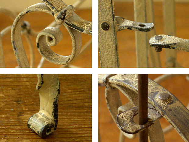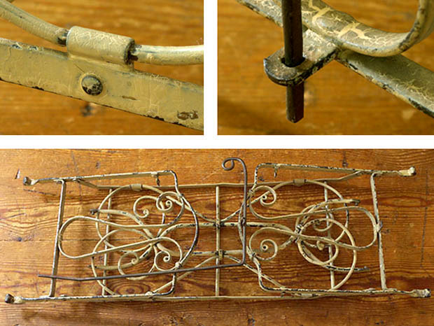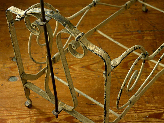 フランスでおそらく1900年代にビスキュイプーペ(ビスクドール)用に製作されたフェール(鉄)製のイヴォワールフェール・プーペヴァルダキャンベルソーです。こちらは超レアなプーペ(ドール)用のLit(リ/ベッド)で、イヴォワールに塗装された本体は19世紀末から20世紀初頭に流行ったアールヌーヴォーの曲線的なデザインで作られています。また、本体のテット(頭)とピエ(足)とカードルラテラル(サイドフレーム)部分にはフェールがツタのように曲げられたアラベスク模様でデザインされていて豪華でエレガントでオシャレでとてもいい感じです。また、床の部分もしっかりと作られていてマトゥラも置きやすくてとてもいいですね。また、4本のフェールの脚は先端が猫足のように丸めて作られているのも可愛いですね。また、本体のテット(頭)側にはヴァルダキャン用の支柱を取り付けるための穴が二箇所あります。また、淡いロゼの木綿の生地で作られたオレイエ(枕)と敷布団とロゼ(ピンク)の木綿の生地のクヴェール(カバー)が掛けられた厚手のしっかりとしたマトゥラ(マットレス)も付属しているのが嬉しいですね。また、仕舞うときには簡単に折りたためるのもいいですね。この当時のプーペ用のヴァルダキャンリは玩具会社の大量生産ではなくて町の腕のいい鍛冶屋や玩具工房が特注で製作していたようなのでとても作りがいいですね。ビスキュイプーペやテディウルス(テディベア)といっしょに飾るととても素敵な一世紀以上も前にフランスで製作された豪華でエレガントでオシャレな大変素晴らしい価値ある一品です。ビスキュイプーペ以外にも小さなテディウルス(テディベア)などを寝かせてあげてもとても可愛いですが、プーペ用の家具などといっしょに飾るともっと世界観があって可愛くなりそうですね。可愛いプーペヴァルダキャンベルソーリは見ているだけでロマンチックな気分にさせられてしまいそうな大変素晴らしい一品です。(テディウルスのぬいぐるみは付属しません)