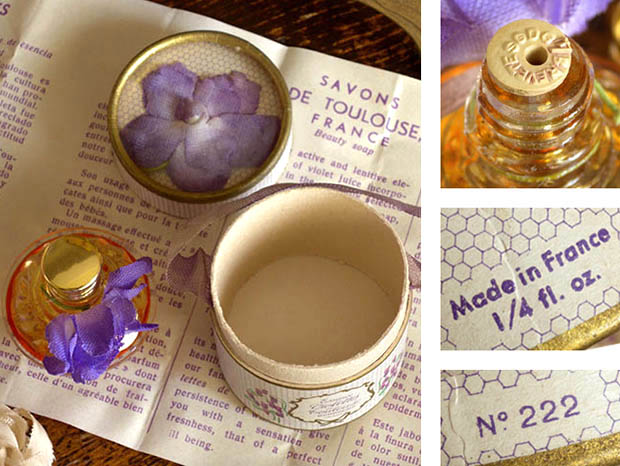マルセーユから西へ150kmほど行ったトゥールーズのキュグノーの町で1902年に創設されたBerdoues(ベルドゥー社)が、おそらく1940年代に製造したViolettes de Toulouse(ヴィオレット・ドゥ・トゥールーズ)という商品名のブローシュアー(リーフレット)とボワット(ボックス)付きのパルファンフラコン(パヒユームボトル)です。1850年代頃からトゥールーズの町ではヴィオレット(スミレ)の花の栽培が協同組合ができるほど盛んになりパリ、ロンドン、ウィーン、ブダペストそしてモスクワまで列車で配送していたようです。ベルドゥー社はそのヴィオレットの花から香水を製造して1936年に発売したViolettes de Toulouseはヨーロッパでとても有名な香水だったようです。こちらは超激レアなフタの上部の透明なセルロイド板の中に布製のヴィオレットのお花のコサージュが入った凝った作りの筒型のヴィオレ(スミレ色)のリュバン(リボン)が付いたボワット(ボックス)に入ったメタル製のオール(ゴールド)のフタの付いたパルファンフラコンで、花びらのような美しいレリーフの本体にはヴィオレでEssence(エッセンス/精油) Violettes de Toulouse Berdoues Franceのロゴと文字がデザインされたオールのエティケット(ラベル)が貼られていてエレガントでオシャレでとてもいい感じです。また、オールの縁取りがあるボワットにもEssence Violettes de Toulouse Berdoues France Made in France 1/4 fl. oz(約7.3ml) No 222 のロゴと文字とヴィオレットのお花のイラストがデザインされているのも素敵ですね。また、三つ折りのブローシュアー(リーフレット)が付属していてヴィオレでデザインされたシャトーのイラストがロマンチックです。ボワットのフタにコサージュが入っているヴィオレットのパルファンフラコンはフランスでも大変人気が高くて入手が大変難しくなってきているようです。エレガントで爽やかなヴィオレットの香りのフラコンとボワットにうっとりと見とれてしまいそうな大変素晴らしい超激レアな一品です。