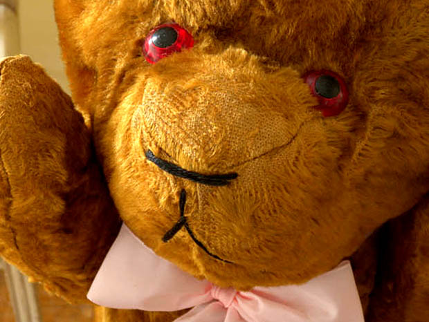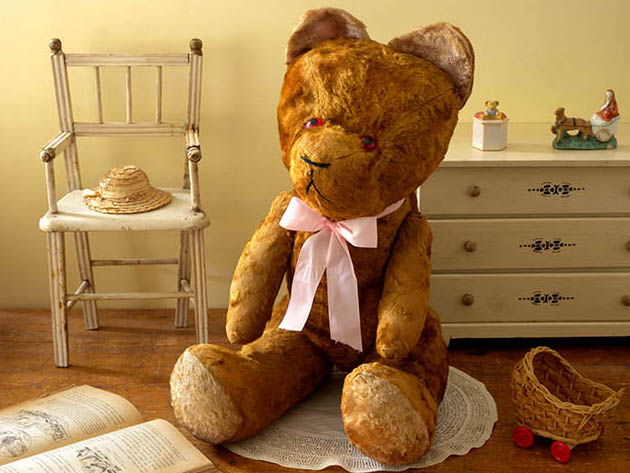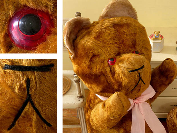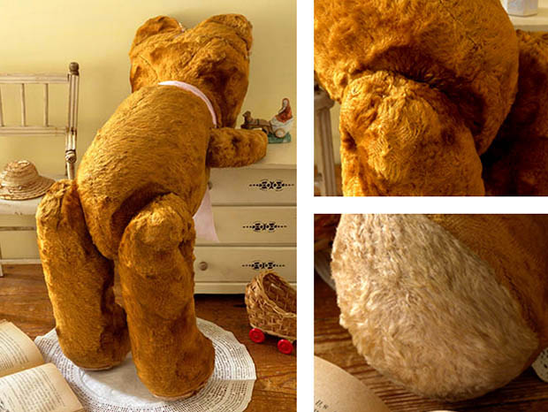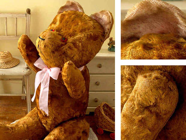 パリ郊外のEssonne(エソンヌ県)のMassy(マッシー)の町にあるJ. P. M.(Jouet Paris Massy/ジ・ペ・エム)社が、おそらく1950年代に製造したぬいぐるみのショコラブラン&カフェクレームレーヌ・べべテディウルスです。J. P. M.(ジ・ペ・エム)はフランス語でJouet Paris Massy(ジュエ・パリ・マッシー)のことのようで「パリのマッシーのおもちゃ」という意味のようです。また、ジ・ペ・エム社の工場はやはりパリ郊外のSeine(セーヌ県)とOise(オアーズ県)にもあったようです。Teddy Ours(テディウルス/テディベア)は、1902年にアメリカのルーズベルト大統領が熊狩りで傷を負ったウルス(ベア)を逃がしてやったことが評判になったことで、ニューヨークの玩具店がドイツから輸入したウルスのぬいぐるみにルーズベルト大統領の愛称のTeddy(テディ)の名前を付けて売り出したのがテディウルスの始まりのようですが、世界で最初にウルスのぬいぐるみを製作したのはドイツのシュタイフ社のようです。こちらは超激レアなオリジンヌ(オリジナル)のロゼパール(ペールピンク)のリュバン(リボン)を首に結んだショコラブラン(チョコレートブラウン)のレーヌ(ウール)で作られたとても大きなサイズのまだべべ(ベビー)のテディウルスで、つぶらなルージュ(レッド)とノアール(ブラック)のアンファン(子供)達に安全なプラスチックの目とノワールの糸で刺繍されたお鼻の下のお口で優しく微笑んでいるような表情がオシャレで可愛くてとてもいい感じです。また、耳の内側はロゼ(ピンク)がかったカフェクレーム(クリームコーヒー)色のレーヌで作られているのも素敵です。また、後ろ足にはカフェクレーム色のレーヌのパッドが縫い付けられていてとても作りがいいですね。また、前脚と後脚が太い針金でジョイントされているのでいろんなポーズが付けれますが、体の中は全て硬いザクザクとした木毛が詰められているようです。また、布タグはありませんが、おそらく首にはMarque Deposee(登録商標) Le Jouet Paris Massy(ラ・ジュエ・パリ・マッシー) Seto, J. P. M.と書かれた厚紙製のクール(ハート)形のタグが付けられていたようです。また、ジ・ペ・エム社のテディウルスの特徴は耳の外側と内側が対照的な色合いのようですが、ショコラブランとカフェクレームの色合いがフランスらしくて大変オシャレですね。また、ジ・ペ・エム社のテディウルスは、フランスでも大変人気が高いので入手が大変難しくなってきているようですが、こんなに大きなサイズのテディウルスは超激レアでこの機会を逃すと滅多にお目にかかれないようです。フランスから遥々やって来た可愛いべべのテディウルスが傍にいるだけで気持ちが優しく癒されてしまいそうな大変素晴らしい一品です。