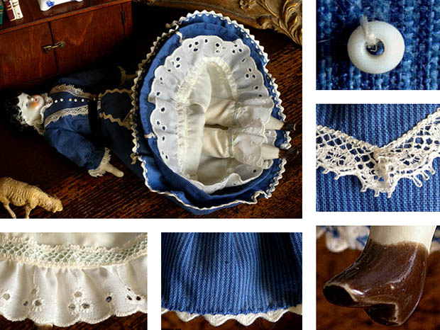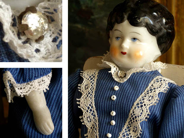 ドイツでおそらく1910年代にビスキュイ(ビスク/磁器)と木綿の生地などで製作されたニュイブルー&ブランシュローブ・シーヌ・テット・プーペです。Chine Tete Poupee(シーヌ・テット・プーペ/チャイナヘッドドール)は、おそらく1830年代から1940年代頃までにドイツなどの国で製作されたプーペ(人形)で、ヨーロッパのブルジョアのマドモアゼルやマダム達の間で大変人気の高かったプーペのようです。こちらは超レアな彩色されたシュヴノワール(黒髪)に襟ぐりと袖口と胸元から裾にかけてにブランシュ(ホワイト)のアラベスク模様のドンテル(レース)のリューシュ(フリル)飾りとタイユ(ウエスト)にノワール(ブラック)のヴルール(ベルベット)のリュバン(リボン)のサンテュール(ベルト)が付いたニュイブルー(ナイトブルー)の木綿の生地のローブ(ドレス)を着たフィーユ(少女)のシーヌ・テット・プーペで、彩色されたつぶらな灰色がかったブルーの瞳とルージュの口元で優しく微笑んだ表情がエレガントでオシャレで可愛くてとてもいい感じです。また、襟ぐりの正面に飾られたディアマン(ダイヤモンド)のように美しいガラス製の宝石と胸元と背中に付けられたブランシュの沢山のペルル(ビーズ)のブトン(ボタン)とタイユのサンテュールに付けなれた琥珀のようなお飾りも素敵です。また、ローブの下には裾にブルーパール(ペールブルー)のリュバンとブランシュのお花模様の刺繍のリューシュ飾りの付いたイヴォワールブランシュ(アイボリーホワイト)の木綿のジュポン(ペチコート)とジュポンと同じデザインのキュロット(ショーツ)を履いているのもオシャレです。また、ビスキュイ製の足には彩色されたブランフォンセ(ダークブラウン)のショスュール(靴)を履いているのも素敵です。また、頭から胸までと肘から手、膝から足まではビスキュイ製で胴体と腕と脚がジョイントされています。また、その他の部分は布地で作られていておそらく中には柔らかなカポック(パンヤノキの綿毛)のようなものが詰められているようです。また、ローブを脱がすことができないので製造会社についての詳しいことは良く分かりませんが、細部まで丁寧に作られたとても凝った作りのプーペなのでしっかりとした工房で製作されたようです。ニュイブルーのローブを着て優しく微笑んだ美しいフィーユのプーペに見つめられているだけでどんどんとシーヌ・テット・プーペの世界へ引きずり込まれて行ってしまいそうな超レアな可愛い価値ある一品です。