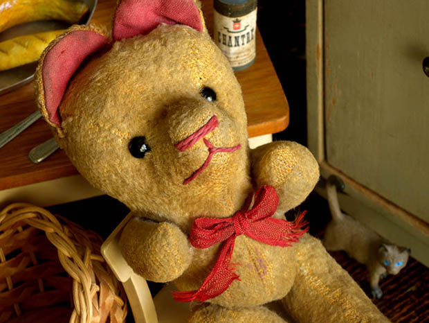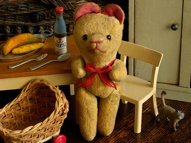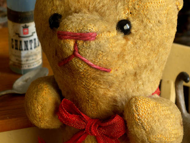パリ郊外のEssonne(エソンヌ県)のMassy(マッシー)の町にあるJ. P. M.(Jouet Paris Massy/ジ・ペ・エム)社が、おそらく1940年代の終わり頃に製造したぬいぐるみのオールレーヌ&ルージュブランティッシュ・べべテディウルスです。J. P. M.(ジ・ペ・エム)はフランス語でJouet Paris Massy(ジュエ・パリ・マッシー)のことのようで「パリのマッシーのおもちゃ」という意味のようです。また、ジ・ペ・エム社の工場はやはりパリ郊外のSeine(セーヌ県)とOise(オアーズ県)にもあったようです。Teddy Ours(テディウルス/テディベア)は、1902年にアメリカのルーズベルト大統領が熊狩りで傷を負ったウルス(ベア)を逃がしてやったことが評判になったことで、ニューヨークの玩具店がドイツから輸入したウルスのぬいぐるみにルーズベルト大統領の愛称のTeddy(テディ)の名前を付けて売り出したのがテディウルスの始まりのようですが、世界で最初にウルスのぬいぐるみを製作したのはドイツのシュタイフ社のようです。こちらは超レアなオリジンヌ(オリジナル)のルージュフォンセ(ダークレッド)のリュバン(リボン)を首に結んだオール(ゴールド)のレーヌ(ウール)で作られたまだべべ(ベビー)のテディウルス、つぶらなノワール(ブラック)のガラスの目とルージュブラン(レッドブラウン)の糸で刺繍されたお鼻の下のお口で優しく微笑んでいるような表情がオシャレで可愛くてとてもいい感じです。また、耳の内側もルージュブランのティッシュ(生地)で作られているのも素敵ですね。また、前脚と後脚が太い針金でジョイントされているのでいろんなポーズが付けれますが、体の中は全て硬いザクザクとした木毛が詰められているようです。また、布タグはありませんが、おそらく首にはMarque Deposee(登録商標) Le Jouet Paris Massy(ラ・ジュエ・パリ・マッシー) Seto, J. P. M.と書かれた厚紙製のクール(ハート)形のタグが付けられていたようです。また、ジ・ペ・エム社のテディウルスの特徴は耳の外側と内側が対照的な色合いのようですが、オールとルージュブランの色合いですがフランスらしくて大変オシャレですね。また、ジ・ペ・エム社のテディウルスは、フランスでも大変人気が高いので入手が大変難しくなってきているようです。フランスから遥々やって来た可愛いべべのテディウルスが傍にいるだけで気持ちが優しく癒されてしまいそうな超レアな大変素敵な一品です。