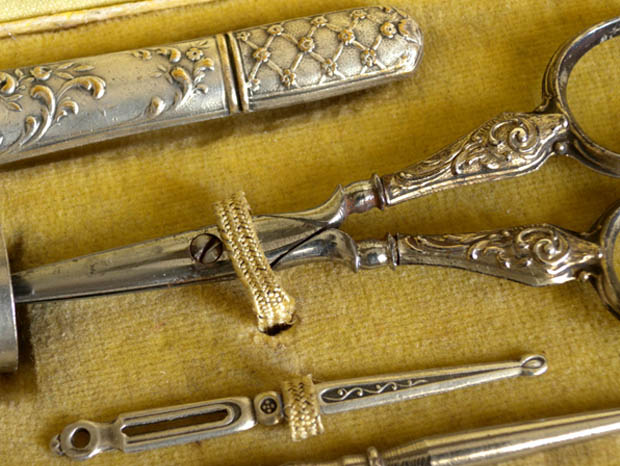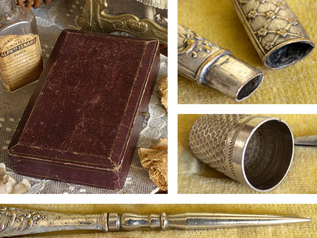 パリから南東へ130kmほど行ったAuxerre(オーセール)の町にあるCollerey(コレリー)社が、おそらく1920年代に製造した木製のボワット(ボックス)に入ったネセセール・ドゥ・クチュール5アンサンブルです。こちらは超レアなブランルージュフェンセ(ダークブラウンレッド)の革のような柄の化粧紙が貼られた木製のボワットに入ったおそらく真鍮にアルジャン(シルバー)メッキされたの5個のNecessaire de Couture(ネセセール・ドゥ・クチュール/ソーイングセット)で、ボワットのフタはヒンジで開閉してフタと本体には真鍮製の留め金が付けられています。また、フタの裏側はクレーム(クリーム)のソワ(シルク)のような光沢のある柔らかな生地が張られています。また、生地にはノワール(ブラック)でCollerey, Coutelier(クトゥリエ/刃物製造業) Auxerreの文字がデザインされていてとても素敵です。また、本体の中は木部の上に淡いベージュのヴルール(ベルベット)のような生地が張られていますが、中に入れるものが上手く収まるようにように窪みが付けられていてとても作りがいいようです。また、Etui Aiguille(エチュイ・エギュイーユ/針ケース)、De(デ/指ぬき)、Ciseaux(シゾー/ハサミ)、Passe-Lacet(パスラセ/紐通し)、Poincon(ポワソン/千枚通し)がアンサンブル(セット)されていますが、手の込んだアールヌーヴォーのアラベスク模様がルリエフ(レリーフ)でデザインされていてエレガントでオシャレでとてもいい感じです。また、シゾーの刃の部分とポワンソンの針の部分は真鍮では作れないので刃金で作られているようです。一世紀以上も前に製造されたものですが、シゾーの刃の切れ味がとてもいいのでまだまだ便利に使えそうですね。フランスでも大変人気の高いネセセール・ドゥ・クチュールは使っても飾っても当時のフランスのブルジョワのマドモアゼルやマダム達のような優雅な気分にさせてくれそうな大変素晴らしい一品です。