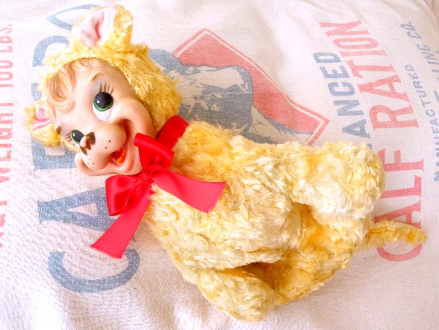 代に製造した顔がラバー製で体がぬいぐるみのコーンブロンド&ピンクベビーライオンドールです。こち