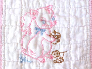 ズエンブロイダリーキルトクリブブランケットです。こちらは6枚の無地のピンクのブロックと6枚のアイ