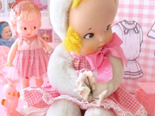 れる可愛いニッカーボッカー社のホワイト&ピンクハウンズトゥースバニーガールドールです。