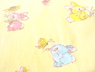 ローのファブリックにはピンクとブルーとイエローのバニーとバタフライのイラストがプリントされてい