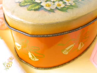 されたチョコレートが入っていたエッグフォルムのトフィー缶で、フタには春のきれいなお花が咲いた川