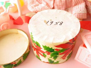 こちらはドール用のハットボックスで、フタと本体にはアイボリー地に赤い実を付けた緑のヒイラギの葉