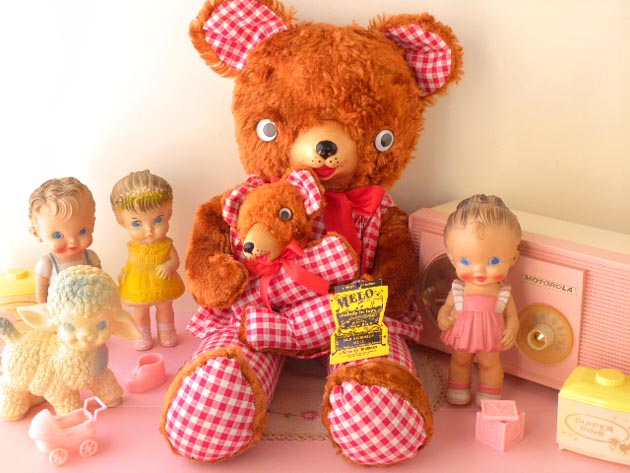 ミーとベビーベアのドールで、レッドとホワイトのギンガムチェックのワンピースを着たマミーベアがお