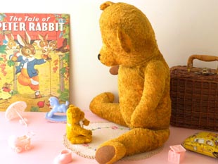 こちらは大変レアなゴールドのモヘアで作られたベビーとマミーベアのドールで、頭と腕と脚が動かせて