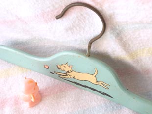 こちらはレアな木製のブルーグリーンのベビーハンガーとフランネルのパステルカラーのストライプのドー