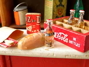 ク製のコカコーラボトルとSesame(ゴマ)とPaprika(パプリカ)が入ったジャー、木製のCampbell Soup(キャ