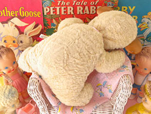 ンを結んだアイボリーホワイトのプラッシュで作られたまだベビーのベアドールで、マミーベアにしかられ