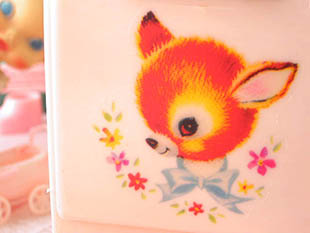 ンですが、扉にはピンクやイエローのきれいなお花に包まれたペールブルーのリボンを首に結んだバンビの
