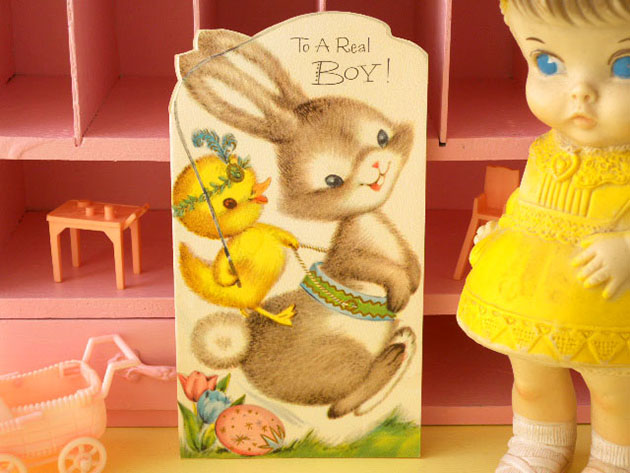 バニーとベビーダックリンググのイースターカードで、表面にはTo a Real Boy!(素直な少年へ)の文字とベ