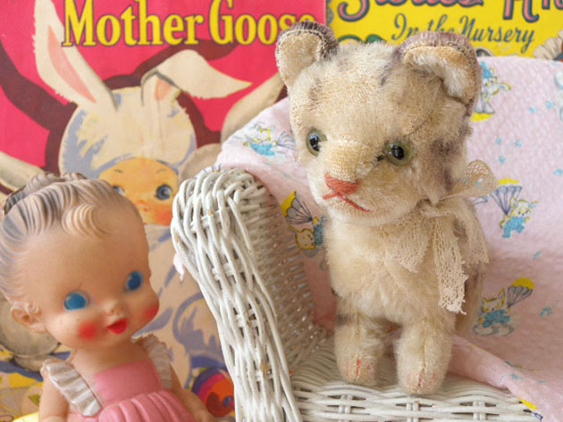 1880年にドイツでマルガレーテ・シュタイフが創設したシュタイフ社が、おそらく1940年代の終わり頃から1950年代の初め頃に製造したTabby(タビー)という商品名のぬいぐるみのアイボリーレースリボンベビータビーキトゥンです。1860年代頃にマルガレーテが二人の姉達と自宅の二階で洋裁店を始めましたが、1880年に甥や姪のために制作した小さなゾウのぬいぐるみが評判になり行列ができるほど売れたので洋裁店からぬいぐるみの制作会社に変えてスタートしたことがシュタイフ社の始まりのようです。こちらは大変レアなベージュとグレーブラウンの高級なモヘアで作られたベビーキトゥンのぬいぐるみで、アイボリーのレースのリボンを首に結んでつぶらなブラックとペールグレーグリーンのグラスアイとピンクの糸でステッチされたお口でマミーを見つめながら優しく微笑んだような表情が可愛くてとてもいい感じです。また、足に彩色されたピンクのツメも可愛いですね。左の耳にはシルバーのイヤーボタンとイエロータグは元からないようですが、1940年代の終わり頃には厚紙のハングタグだけでボタンやイエロータグのない製品もあったようです。首のハングタグは欠損していますが丁寧に作られた顔や体のフォルムからおそらくタビーキトゥンのようです。また、1950年代以降のシュタイフ社のぬいぐるみの体の中には新素材の柔らかな感触のラバーが詰められている製品が多いですが、こちらのタビーキトゥンの体の中は高級なヴィンテージのテディベアと同じようにウッドウール(木毛)が詰められていてお腹を押さえるとウッドウールのザクザクした感触がありとても作りがいいですね。まだ生まれたばかりのような小ちゃなベビーのキトゥンですが、この子がいるだけで辺りが優しいメルヘンチックな雰囲気に包まれてしまいそうなキュートで可愛いシュタイフ社のアイボリーレースリボンベビータビーキトゥンです。