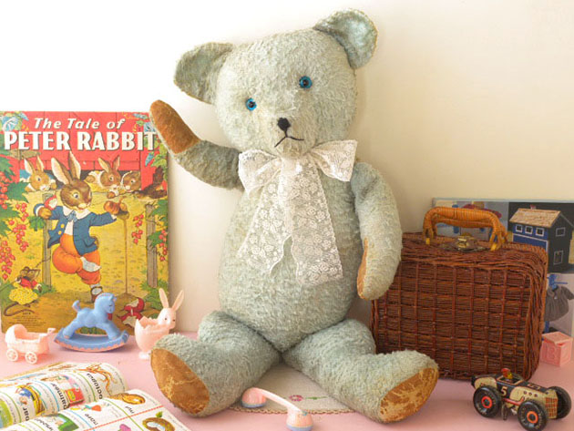 イギリスでおそらく1930年代に製造されたグロウラーが内蔵されたぬいぐるみのペールブルーグリーン・オールドイングリッシュテディベアです。イギリスは1913年頃まではテディベアはドイツから輸入していましたが、1914年に第一次世界大戦が勃発するとテディベアの輸入ができなくなり1915年頃からテディベアはイギリスで独自に製造されるようになったようですが、イギリスで最初にテディベアを製造したのはFarnell(ファーネル)社のようです。また、戦時中でモヘアなどの材料が不足していたのでイギリス製のテディベアはモヘアの生地の使用をどんどん少なくして製造していったので鼻が短いフラットフェイスのテディベアが特徴となったようです。こちらは超レアな首にフランスのアンティークのお花模様のレースのリボンを結んだペールブルーグリーンのウールで作られたトラディショナルなオールドイングリッシュの大きなテディベアで、つぶらなブルーとブラックのグラスアイ(ガラスの目)と黒い糸でステッチされたお鼻とお口で優しく微笑んでいる姿がオシャレで可愛くてとてもいい感じです。頭と前脚と後ろ脚がジョイントされているのでいろんなポーズが付けれますが、頭と胴体と脚の中にはウッドウール(木毛)が詰められているので押すとザクザクした感触があります。また、ジョイント部分には丸い木枠が取り付けられていてとてもしっかりとした作りです。また、前足と後ろ足にはオールドテディベアの特徴のプラウンのオイルクロスのパッドが縫い付けられています。また、この時代はまだそれほど材料が不足していなかったので顔はフラットフェイスではなくドイツ製のように鼻の長いテディベアです。また、爪の刺繍は元からありません。また、布地のタグはありませんがタグは1950年代頃から付けられるようになりこの時代のテディベアは厚紙製のハングタグが付けられていたようです。また、製造メーカーについての詳しいことは良く分かりませんが、オールドイングリッシュベアらしい風格があってとてもいい雰囲気です。また、この当時のブルーのグラスアイにペールブルーグリーンの体のテディベアは大変珍しくてやはり超レアですね。また、お腹の中にはグロウラーが内蔵されているので両手で持って寝かせた状態から立たせてあげると「グァー」と鳴いてまるで本当に生きているようで驚いてしまいます。グロウラーが壊れずに作動するテディベアはとても少ないですが、1930年代製で作動するグロウラーは大変作りがいいですね。イングランドからはるばるやって来たテディベアですが、一度会ったらもう何処へも帰したくなくなってしまいそうな可愛い超レアな一品です。