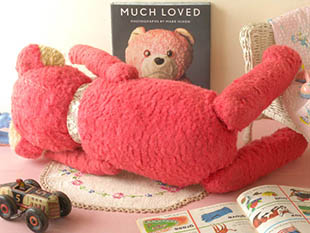 ドイツのゾンネベルクの町で1912年代にBernhard Hermann(ベルンハルト・ヘルマン)が創設したテディ・ヘルマン社が、おそらく1940年代の初め頃に製造したぬいぐるみのローズピンク&アイボリーウール・ヘルマンテディベアです。ドイツのゾンネベルクの町に近い小さなNeufang(ノイファン)の村で1907年にJohann Hermann(ヨハン・ヘルマンが木製の玩具を製作するおもちゃ会社を創設したようです。ヨハンには息子や娘達がいましたが、1912年にはゾンネベルクの町で兄のBernhard Hermann(ベルンハルト・ヘルマン)が父親の後を継いでTeddy Hermann(デディヘルマン)社を創設してぬいぐるみの製造をしたようです。また、1920年代にはやはりゾンネベルクの町で弟のMax Hermann(マックス・ヘルマン)もマックス・ヘルマン社を創設してぬいぐるみの製造を始めたようです。テディベアは、1902年にアメリカのルーズベルト大統領がベアハンティングで傷を負ったベアを逃がしてやったことが評判になったことで、ニューヨークの玩具店がドイツから輸入したベアのぬいぐるみにルーズベルト大統領の愛称のTeddy(テディ)のネームを付けて売り出したのがテディベアの始まりのようですが、世界で最初にベアのぬいぐるみを製作したのはドイツのシュタイフ社のようです。シュタイフ社はおそらく1900年頃からベアのぬいぐるみの製造をは始めていますが、テディ・ヘルマン社も12年遅れで製造しているのでドイツでは大変古いテディベアの製造会社のようです。こちらは超レアな首にフランスのアンティークのローズのお花模様のレースのリボンを結んだローズピンクとアイボリーのウールで作られたドイツらしい鼻の長いトラディショナルなテディベアで、つぶらな黒と琥珀色のグラスアイ(ガラスの目)とブラックの糸でステッチされたお鼻の下のお口で優しく微笑んでいるような表情がオシャレで可愛くてとてもいい感じです。また、耳の内側はアイボリーですが外側はローズピンクとアイボリーのツートンカラーで作られていてこんなオシャレなテディベアは見たことがなくやはり大変珍しいですね。また、前脚と後脚がジョイントされているのでいろんなポーズが付けれますが、頭と胴体と脚の中にはウッドウール(木毛)が詰められているので押すとザクザクした感触があります。また、前足と後ろ足にはアイボリーの生地のパッドが縫い付けられています。また、黒い糸の爪は元からないタイプです。また、布地のタグはありませんがタグは1950年代頃から付けられるようになりこの時代のテディベアは厚紙製のハングタグが付けられていたようです。また、この当時はゴールドやブラウンのモヘアのテディベアが多く作られていますが、ローズピンクのウールのテディベアはやはり珍しくて超レアですね。ドイツからはるばるやって来たテディベアですが、一度会ったらもう何処へも帰したくなくなってしまいそうなローズピンクが可愛い超レアな最高に素晴らしい一品です。
