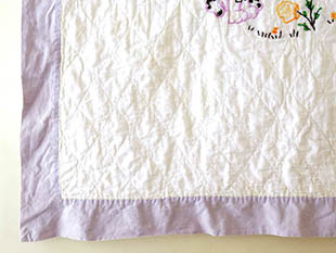 アメリカでおそらく1950年代にベビークリブ用のブランケットとして制作されたコットン製のスリーリトルキトゥンズ・ベビークリブキルトブランケットです。こちらは大変レアなホワイトとラベンダーカラーのファブリックでベビーのために手作りされたキルトブランケットで、本体の表面にはThree little kittens have found their mittens(三匹の子猫達は手袋を見つけました)のアルファベットの文字と野原でミトン(手袋)を見つけて喜んでいるイエローのキトゥンとミトンを口にくわえているピンクのキトゥン、枝に掛かっていたミトンを見つけて喜んでいるパープルのキトゥン達のスリーリトルキトゥンズのお話のイラストがピンク、オレンジ、ブルー、グリーン、イエロー、パープル、ブラックなどの糸でアウトラインステッチやサテンステッチなどで丁寧に手刺繍されていてオシャレで可愛くてとてもいい感じです。また、裏地にはホワイトの無地のファブリックが使われていますが、本体の周囲のパイピングのボーダーにはラベンダーの無地のファブリックが使われています。また、本体には薄く中綿が詰められているのでずれないように格子模様にミシンでキルティングされているのもオシャレです。スリーリトルキトゥンズのお話は、三匹のキトゥン達が野原でミトンを失くしてしまいますが、直ぐに見つけてきたのでマミーキャットからおやつの美味しそうなパイをもらいますが、ミトンを付けたままパイを食べてしまったのでマミーキャットに叱られてしまうお話のようですが、キトゥン達の刺繍のイラストを見ているだけで気持ちが優しく癒されてしまいそうですね。ベビーが楽しい夢を見ながらぐっすりと眠れるように願いながら作られたクリブキルトブランケットは、当時のマミーのベビーへの優しい愛情がぎっしりと詰まった素晴らしい価値ある一品です。