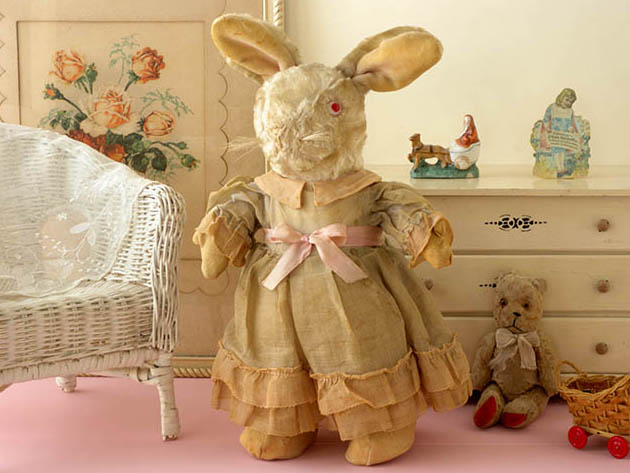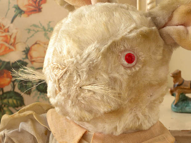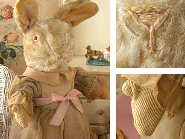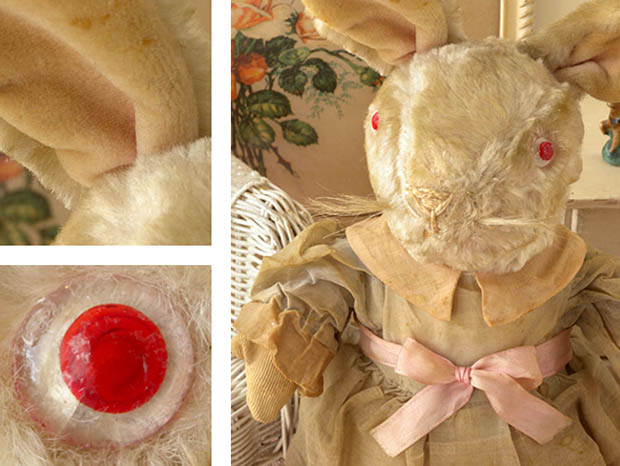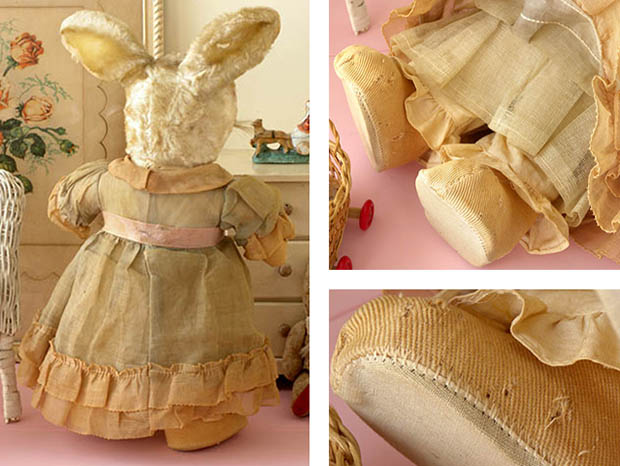アメリカのコネチカット州のノーウォークで1898年にドイツ移民のアドルフ・ガンドが創設したニューヨークの五番街にあるGund(ガンド)社が、おそらく1930年代に製造したぬいぐるみのピンク&ベージュドレス・ベビーガールイースターバニーです。こちらは超レアなオリジナルのサーモンピンクの襟の付いたベージュのオーガンジーの生地のベビードレスを着たアイボリーの高級なモヘアで作られたベビーのガールバニーで、つぶらな透明とレッドピンクのガラスの目と淡いサーモンピンクの糸で刺繍されたお鼻の下のお口でマミーラビットを見つめながら優しく微笑んでいるような表情がオシャレで可愛くてとてもいい感じです。また、袖口と裾に付けられたサーモンピンクのフリル飾りとウエストで結んだピンクのリボンもオシャレです。また、お鼻の横のアイボリーのおヒゲはビニールではなくておそらくヤシ科のシュロで作られているようでとても凝った作りです。また、耳の内側は柔らかなサーモンピンクのベルベットのような柔らかな生地で作られているのも素敵です。また、手と足はサーモンピンクの厚手の木綿の生地で作られています。また、ドレスの裏はベージュのオーガンジーの生地と二枚重ねで作られていますが、その下には淡いベージュピンクの木綿の裾にフリル飾りが付いたペチコートパンツを履いているのも可愛いですね。また、頭と胴体と脚の中にはおそらくウッドウール(木毛)が詰められているので押すとザクザクとした硬い感触があります。また、頭と胴体と前脚と後脚はジョイントではありませんが、さすがに1930年代に作られたガンド社のバニーは作りが良くて堂々としていて貫禄があります。また、ガンド社はチャイルド用の玩具を沢山製造しているトイメーカーなので、バニーの目はチャイルド達の安全を考えて1940年代の終わりころからプラスチック製のセフティーアイにしているようですが、こちらは1930年代に製造された古いバニーのぬいぐるみなので目は高級なテディベアと同じようにガラス製のグラスアイです。また、また、布タグはありませんが布タグは1950年代の中頃から付けられるようになりこの時代のテディベアには首に厚紙製のハングタグが付けられていたようです。当時の3月下旬から4月下旬の日曜日のイースター(復活祭)の日は、チャイルド達がカラフルに塗られたイースターエッグ(ゆで卵)を探したりこちらのような可愛いイースターバニーといっしょに楽しく遊んでいたのでしょうね。可愛いドレスを着たベビーガールバニーが傍にいるだけでとてもメルヘンチックな気分にさせられてしまいそうな大変素晴らしい超レアな一品です。