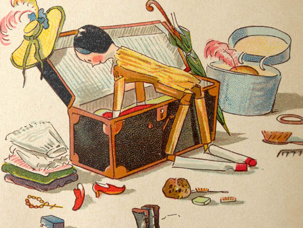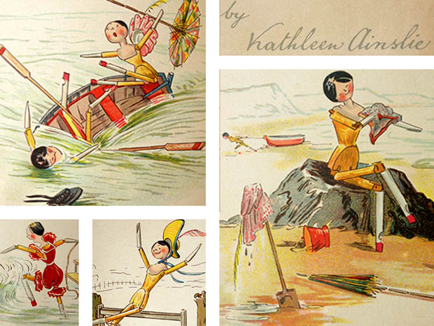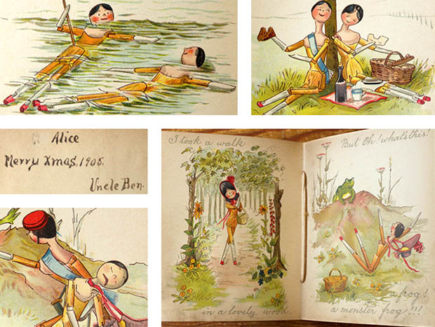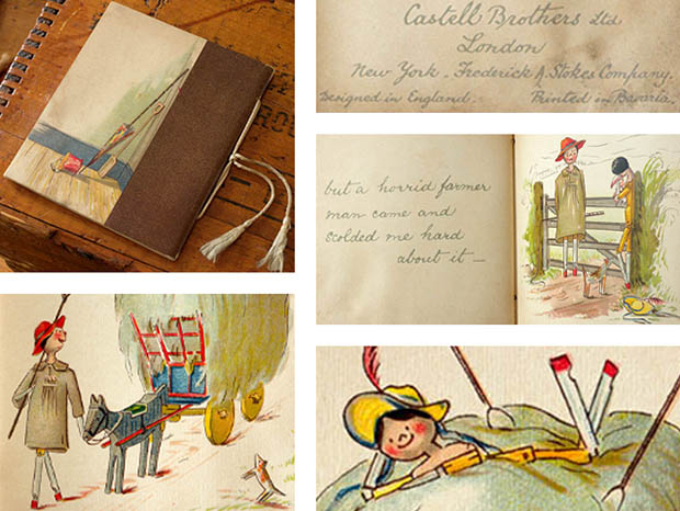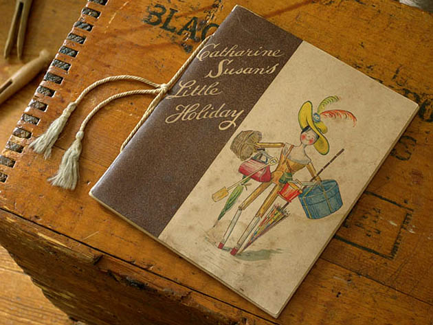 イギリスのロンドンにあるCastell Brothers Ltd.(キャステル・ブラザーズ出版社)とアメリカのニューヨークにあるFrederick A. Stokes Company(フレデリック・アボット・ストークス出版社)が1900年代に同時に出版した厚紙製のキャサリン・スーザン・アンド・ミー・ゴーズ・アブロード・ペグドールピクチャーブックです。Peg Doll(ペグドール)はイタリアの南チロル地方のヴァル・ガルデーナの町で作られた木製のドールが始まりのようですが、その後ドイツやオランダやアメリカで多く製作されたようです。また、Peg Doll(ペグドール)の名前はClothespeg(クロスペグ/洗濯バサミ)のペグから付けられたようです。また、初期の頃のペグドールは木製の洗濯バサミの側面に穴を空けて腕になる木の棒を差し込んだだけのものでしたが、その後にお顔の彩色がされ腕や脚はジョイントで動かせるようになったようです。また、ペグドールは衣服を着せられていない状態で販売されていたようなのでチャイルド達は布切れから自分でドレスを作ったようです。また、ペグドールはPenny Doll(ペニードール)とも呼ばれていますが、これは1ポンドの100分の1のペニー(1セント)の価格のドールのことのようです。また、ペグドールは当時は高価なビスクドールが買えない庶民のチャイルド達のドールでしたが、今では世界中で人気が高くてとても高価なドールになっているようです。こちらは超激レアなペグドール達がデザインされたPicture Book(ピクチャーブック/絵本)で、本体は表紙を入れて全部で36ページあり中ページは文章とカラーイラストが16点とモノクロイラストが1点あります。また、本体はアイボリーホワイトのシルクのフリンジのある紐で中綴じされているのも素敵です。また、アイボリーとダークブラウンの表紙にはCatharine Susan’s Little Holiday(キャサリン・スーザン・リトルホリデー/キャサリン・スーザンの短い休日)のタイトルと旅行へ行くための沢山の荷物を持ったキャサリン・スーザンのイラストがデザインされていています。また、裏病には部屋の片隅にカラフルな日傘と木製のシャベルと赤いバケツが置かれたイラストがデザインされていています。また、表紙の裏にはAlice Merry Xmas, 1905, Unele Benと手書きされているので、おそらく1905年のクリスマスの日にアネル・ベン叔母さんがアリスちゃんにプレゼントしたピクチャーブックのようです。最初のページにはCatharine Susan’s Little Holiday by Kathleen Ainslie, Castell Brothers Ltd. London(ロンドンにあるキャステル・ブラザーズ出版社) New York, Frederick A. Stokes Company(ニューヨークにあるフレデリック・アボット・ストークス出版社) Designed in England(イギリスでデザイン) Printed in Bavaria(ドイツのバイエルンで印刷)の表示があります。また、1858年にイギリスのサマセット州のコーフの町で生まれたキャスリーン・エインズリーは、1900年から1911年頃に活躍したイラストレーターのようです。また、彼女は19世紀から20世紀初頭にかけて人気があったジョイント式のペグドールを題材にした絵本の出版で有名なようです。また、1878年に創設されたキャステル・ブラザーズ出版社は、バレンタインカードやクリスマスカードの出版で有名なようです。また、フレデリック・アボット・ストークス出版社は、1881年にフレデリック・アボット・ストークスが創設していますが、1939年までの58年間で3,000冊以上の書籍を出版しているよです。また、その次のページからは、Oh! what a business it was packing up all my clothes. "Please, Mr Ticket-man, give me a tiket for the sea-side". and he did. When I got there. Oh! it was lovely! tomorrow I'll bathe. Tomorrow I did! Anice Sailorman said "Come in my boat, my beautiful lass?" and I said "Yes, please". Oh! Oh! Oooooh! Do you think I was drownded dead? not me! And I soon dried up in the sun(ああ!服を全部詰めるのは大変だった。「チケット係さん、海辺のチケットをください」と頼んだら、彼はそれをくれました。着到着すると、ああ!素敵だった。明日は海水浴に行こう。明日はそうしました。アニス・セーラーマンが「私のボートに乗ってくれないか、可愛い娘さん」と言ったので、「はい、お願いします」と答えました。ああ、ああ、うわぁ。私が溺れて死んだと思ってるの。大丈夫よ。そして直ぐに太陽の下で乾きました)の文章が書かれています。また、お話はペグドールのキャサリン・スーザンがトランクに沢山の服を詰めて休暇旅行に出かけます。彼女は海辺への切符を購入して到着した翌日に海水浴に出かけます。船乗りの誘いに応じてボートに乗りますが転覆してしまい、服を天日干しをしなければなりませんでした。そして陸に戻ると森の中で大きなカエルに驚かされますが、勇敢な兵士に助けられていっしょにピクニックをしますが、この後キャサリン・スーザンはどうなってしまうのでしょうか。また、沢山のイラストがデザインされていますが、どれもオシャレで可愛くてとてもいい感じです。また、イラストは高価な全て特色を使った石版印刷で刷られ
