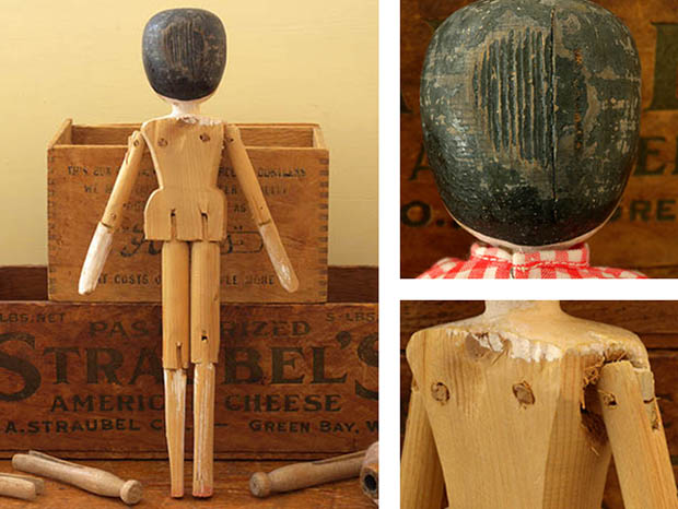 アメリカでおそらく1900年代に製作されたギンガムチェックの木綿のワンピースを着たウッデン(木)製のリトルガール・ウッデンペグドールです。Peg Doll(ペグドール)はイタリアの南チロル地方のヴァル・ガルデーナの町で作られた木製のドールが始まりのようですが、その後ドイツやオランダやアメリカで多く製作されたようです。また、Peg Doll(ペグドール)の名前はClothespeg(クロスペグ/洗濯バサミ)のペグから付けられたようです。また、初期の頃のペグドールは木製の洗濯バサミの側面に穴を空けて腕になる木の棒を差し込んだだけのものでしたが、その後にお顔の彩色がされ腕や脚はジョイントで動かせるようになったようです。また、ペグドールは衣服を着せられていない状態で販売されていたようなのでチャイルド達は布切れから自分でドレスを作ったようです。また、ペグドールはPenny Doll(ペニードール)とも呼ばれていますが、これは1ポンドの100分の1のペニー(1セント)の価格のドールのことのようです。また、ペグドールは当時は高価なビスクドールが買えない庶民のチャイルド達のドールでしたが、今では世界中で人気が高くてとても高価なドールになっているようです。こちらは超レアなレッドとホワイトのギンガムチェックのワンピースを着たリトルガールのペグドールで、彩色された黒髪と肌色に彩色されたお顔のつぶらな灰色がかったブルーの瞳と小さな赤い口元で優しく微笑んでいるような表情がオシャレで可愛くてとてもいい感じです。また、健康そうなピンクのほっぺも可愛いですが、小さなお鼻は彩色ではなく立体で作られています。また、首と胸元も肌色で彩色されていて肘から下の腕と膝から下の脚はホワイトで彩色されていますが、その他は彩色されていなく飴色になった木肌がとてもいいですね。また、頭は固定されていて胴体と腕と肘と脚と膝が全て木材でジョイントされているのでいろんなポーズが楽しめるのが嬉しいです。レッドとホワイトのギンガムチェックのワンピースを着た優しそうなつぶらな灰色がかったブルーの瞳のペグドールに見つめられているだけでどんどんとペグドールの世界へ引きずり込まれて行ってしまいそうな超レアな大変価値ある一品です。