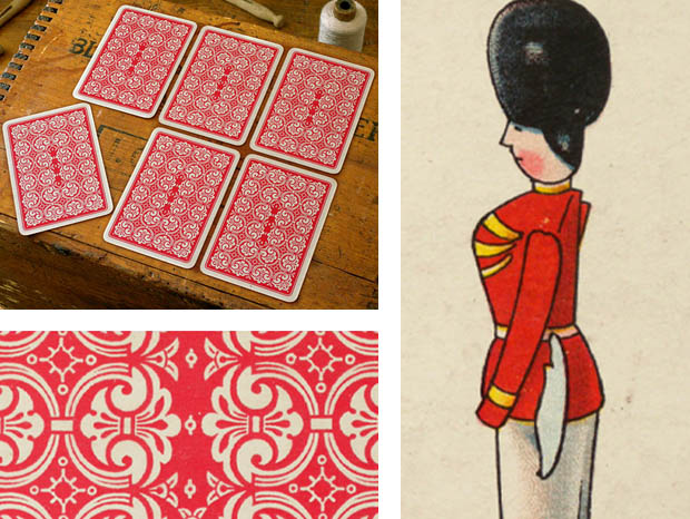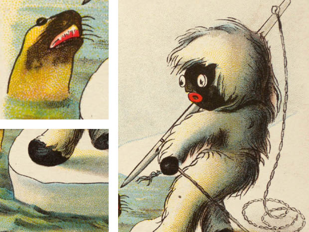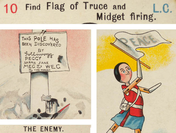 ロンドンで1821年にThomas De La Rue(トーマス・デ・ラ・ルー)が創設したバンヒル・ロウ通りにあるトーマス・デ・ラ・ルー社が、おそらく1900年代に製造した厚紙製のゴリウォーグ&ペグドール・ゲームカード6セットです。トーマス・デ・ラ・ルー社は麦わら帽子製造から創業したようですが、1831年には製造したトランプがイギリス王室御用達となり1855年からは切手の印刷を開始して1860年からは紙幣の印刷も始め会社は大きく発展したようです。Golliwogg(ゴリウォーグ)のキャラクターは、1873年にニューヨークで生まれたイギリス人の画家のフローレンス・ケイト・アプトンが「二つのオランダ人形(ペグドール)とゴリウォーグの冒険」という絵本で制作したもののようです。また、Peg Doll(ペグドール)の名前はClothespeg(クロスペグ/洗濯バサミ)のペグから付けられたようです。また、初期の頃のペグドールは木製の洗濯バサミの側面に穴を空けて腕になる木の棒を差し込んだだけのものでしたが、その後にお顔の彩色がされ腕や脚はジョイントで動かせるようになったようです。また、ペグドールは衣服を着せられていない状態で販売されていたようなのでチャイルド達は布切れから自分でドレスを作ったようです。また、ペグドールはPenny Doll(ペニードール)とも呼ばれていますが、これは1ポンドの100分の1のペニー(1セント)の価格のドールのことのようです。また、ペグドールは当時は高価なビスクドールが買えない庶民のチャイルド達のドールでしたが、今では世界中で人気が高くてとても高価なドールになっているようです。こちらは超レアなGolliwogg A Round Game(ゴリウォーグ・アラウンドゲーム)というゲームカードの6枚セットですが、ゲームはおそらく全部で48枚あるカードを4人位のチャイルド達に5枚位を初めに配ってから残りの裏返しされたカードを順番に1枚ずつ引いていってL. C.(Lead Card/リードカード)に書かれた指示に従って3枚セットの他の2枚のカードを探すというゲームのようです。また、一番多くのセットを集めた人が勝者のようです。また、No.10のリードカードにはFind Flag of Truce and Midget firing(休戦旗と発砲した小さな人形を探してください) L. C.とThe Enemy(敵)の表示と黒い帽子をかぶって赤と白の軍服を着た敵軍の兵士のイラストがデザインされています。また、他のカードはFlag of Truce(休戦旗)の表示とPeace(平和)と書かれた白旗を振っている赤と水色の軍服を着た兵士のペグドールとMidget Firing(射撃中の小さな人)の表示と黒い帽子をかぶって赤と白の軍服を着た敵軍の兵隊を射撃している小さなペグドールのイラストがデザインされていてとても素敵です。また、No.13のリードカードにはFind Golliwogg sealing and the North Pole(ゴリウォーグのアザラシと北極を探してください) L. C.とSarah and the Gulls(サラとカモメ達)の表示とカモメ達に傍に寄られて困っている毛皮の帽子をかぶって水色に白い星模様のワンピースに黒いセーターを着たペグドールのサラ・ジェーンのイラストがデザインされています。また、他のカードはGolliwogg sealing(ゴリウォーグのアザラシ狩り)の表示と割れそうな氷の上から銛(もり)でアザラシ狩りをしている暖かそうな毛皮の服を着たゴリウォーグとThe North Pole(北極)の表示と北極に立っている白いポールに取り付けられたThis Pole has been Discovered by Golliwogg Peggy Sarah Jane Meg & WEg & the Midget(この北極はゴリウォーグ、ペギー 、サラ・ジェーン、メグとウェグと小さな人によって発見されました)と書かれた看板と黒のペンキと筆のイラストがデザインされていますがどれもオシャレで可愛くてとてもいい感じです。また、裏面には白地に赤の幾何学模様がデザインされています。また、イラストは高価な全て特色を使った石版印刷で刷られているので何年経っても発色がよくて素晴らしいですね。120年も前のゴリウォーグとペグドールのゲームカードですが、見ているだけでゴリウォーグドールとペグドールが欲しくなってしまいそうなイギリス王室御用達のトーマス・デ・ラ・ルー社の大変価値ある一品です。