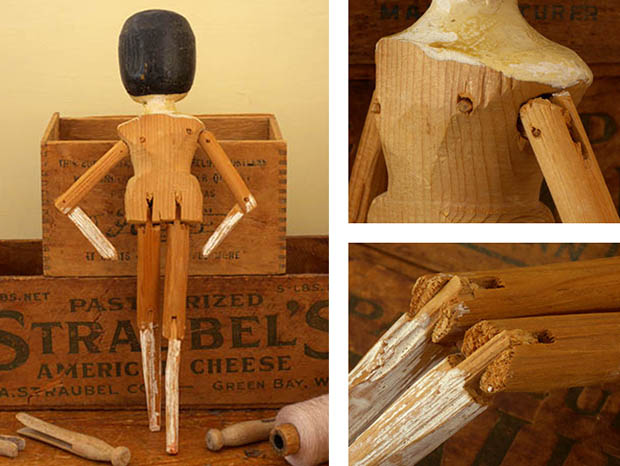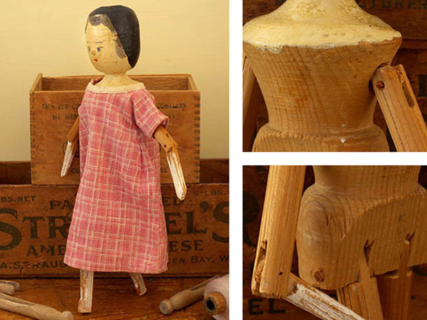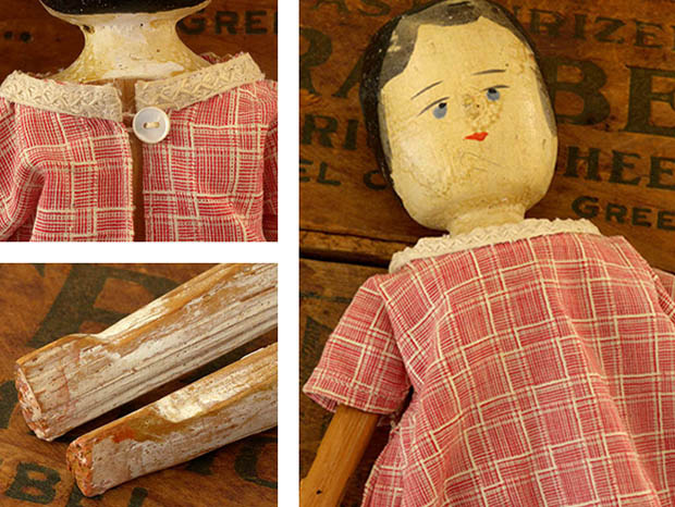 アメリカでおそらく1900年代に製作されたギンガムチェックの木綿のワンピースを着たウッデン(木)製のリトルガール・ウッデンペグドールです。Peg Doll(ペグドール)はイタリアの南チロル地方のヴァル・ガルデーナの町で作られた木製のドールが始まりのようですが、その後ドイツやオランダやアメリカで多く製作されたようです。また、Peg Doll(ペグドール)の名前はClothespeg(クロスペグ/洗濯バサミ)のペグから付けられたようです。また、初期の頃のペグドールは木製の洗濯バサミの側面に穴を空けて腕になる木の棒を差し込んだだけのものでしたが、その後にお顔の彩色がされ腕や脚はジョイントで動かせるようになったようです。また、ペグドールは衣服を着せられていない状態で販売されていたようなのでチャイルド達は布切れから自分でドレスを作ったようです。また、ペグドールはPenny Doll(ペニードール)とも呼ばれていますが、これは1ポンドの100分の1のペニー(1セント)の価格のドールのことのようです。また、ペグドールは当時は高価なビスクドールが買えない庶民のチャイルド達のドールでしたが、今では世界中で人気が高くてとても高価なドールになっているようです。こちらは超レアなピンクとホワイトのチェックのワンピースを着たリトルガールのペグドールで、彩色された黒髪と肌色に彩色されたお顔のつぶらな灰色がかったブルーの瞳と小さな赤い口元で優しく微笑んでいるような表情がオシャレで可愛くてとてもいい感じです。また、ワンピースの襟ぐりに付けられたアイボリーのアラベスク模様のリボン飾りもオシャレですね。また、小さなお鼻は彩色ではなく立体で作られているのも可愛いですね。また、首と胸元も肌色で彩色されていて肘から下の腕と膝から下の脚はホワイトで彩色されていますが、その他は彩色されていなく飴色になった木肌がとてもいいですね。また、頭は固定されていて胴体と腕と肘と脚と膝が全て木材でジョイントされているのでいろんなポーズが楽しめるのが嬉しいです。ピンクとホワイトのギンガムチェックのワンピースを着た優しそうなつぶらな灰色がかったブルーの瞳のペグドールに見つめられているだけでどんどんとペグドールの世界へ引きずり込まれて行ってしまいそうな超レアな大変価値ある一品です。