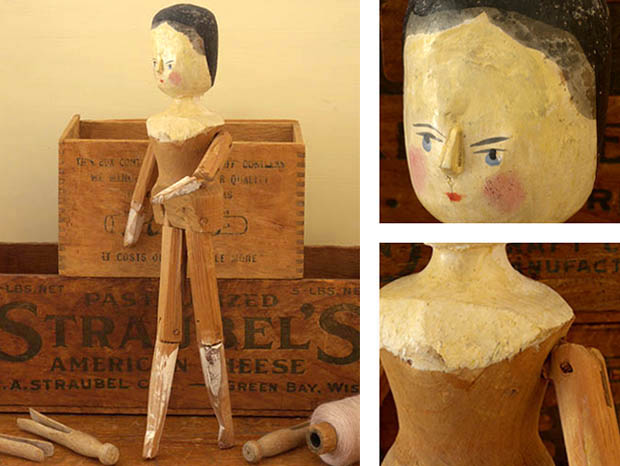 アメリカでおそらく1900年代に製作されたウッデン(木)製のリトルガール・ウッデンペグドールです。Peg Doll(ペグドール)はイタリアの南チロル地方のヴァル・ガルデーナの町で作られた木製のドールが始まりのようですが、その後ドイツやオランダやアメリカで多く製作されたようです。また、Peg Doll(ペグドール)の名前はClothespeg(クロスペグ/洗濯バサミ)のペグから付けられたようです。また、初期の頃のペグドールは木製の洗濯バサミの側面に穴を空けて腕になる木の棒を差し込んだだけのものでしたが、その後にお顔の彩色がされ腕や脚はジョイントで動かせるようになったようです。また、ペグドールは衣服を着せられていない状態で販売されていたようなのでチャイルド達は布切れから自分でドレスを作ったようです。また、ペグドールはPenny Doll(ペニードール)とも呼ばれていますが、これは1ポンドの100分の1のペニー(1セント)の価格のドールのことのようです。また、ペグドールは当時は高価なビスクドールが買えない庶民のチャイルド達のドールでしたが、今では世界中で人気が高くてとても高価なドールになっているようです。こちらは超レアなリトルガールのペグドールで、彩色された黒髪と肌色に彩色されたお顔のつぶらな灰色がかったブルーの瞳と小さな赤い口元で優しく微笑んでいるような表情がオシャレで可愛くてとてもいい感じです。また、健康そうなピンクのほっぺも可愛いですが、小さなお鼻は彩色ではなく立体で作られています。また、首と胸元も肌色で彩色されていて肘から下の腕と膝から下の脚はホワイトで彩色されていますが、その他は彩色されていなく飴色になった木肌がとてもいいですね。また、足の先端はピンクの靴を履いているように彩色されています。また、頭は固定されていて胴体と腕と肘と脚と膝が全て木材でジョイントされているのでいろんなポーズが楽しめるのが嬉しいです。ペグドールは衣服を着せられていない状態で販売されていたので可愛いドレスを作ってあげても楽しいですね。優しそうなつぶらな灰色がかったブルーの瞳に見つめられているだけでどんどんとペグドールの世界へ引きずり込まれて行ってしまいそうな超レアな大変価値ある一品です。