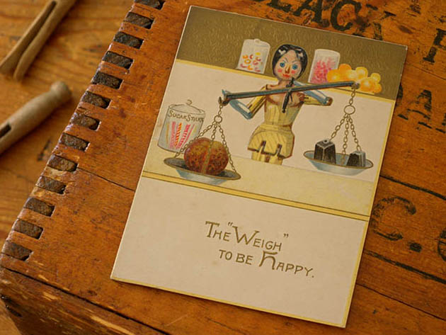 イギリスのロンドンで1866年にラファエル・タックが妻と創設したRaphael Tuck & Sons(ラファエルタック&サンズ)社が、おそらく1900年代に製作した厚紙製のガールペグドール・イン・ザ・キッチン・クリスマスカードです。ラファエルタック&サンズ社はポストカードの製造販売で有名なようです。Peg Doll(ペグドール)はイタリアの南チロル地方のヴァル・ガルデーナの町で作られた木製のドールが始まりのようですが、その後ドイツやオランダやアメリカで多く製作されたようです。また、Peg Doll(ペグドール)の名前はClothespeg(クロスペグ/洗濯バサミ)のペグから付けられたようです。また、初期の頃のペグドールは木製の洗濯バサミの側面に穴を空けて腕になる木の棒を差し込んだだけのものでしたが、その後にお顔の彩色がされ腕や脚はジョイントで動かせるようになったようです。また、ペグドールは衣服を着せられていない状態で販売されていたようなのでチャイルド達は布切れから自分でドレスを作ったようです。また、ペグドールはPenny Doll(ペニードール)とも呼ばれていますが、これは1ポンドの100分の1のペニー(1セント)の価格のドールのことのようです。また、ペグドールは当時は高価なビスクドールが買えない庶民のチャイルド達のドールでしたが、今では世界中で人気が高くてとても高価なドールになっているようです。こちらは超激レアなガールペグドールがデザインされた二つ折りのChristmas Card(クリスマスカード)で、表紙にはThe "Weigh" to be Happy(幸せになるための計量)の文字がゴールドのエンボスでデザインされていてとても素敵です。また、棚にお菓子の入ったキャニスターやフルーツが置かれたキッチンで、天秤ばかりで砂糖菓子の重さを量っているガールペグドールがデザインされていてオシャレで可愛くてとてもいい感じです。また、テーブルにはSucar Sncks(シュガースナック/砂糖菓子)と書かれたキャニスターが置かれているのもオシャレです。また、棚の背景はゴールドでデザインされていますが、イラストには全て立体的なエンボス加工がされていてとても凝った作りです。また、イラストを描いたのはKathleen Ainslie(キャスリーン・エインズリー)のようですが、1858年にイギリスのサマセット州のコーフの町で生まれたキャスリーン・エインズリーは、1900年から1911年頃に活躍したイラストレーターのようです。また、彼女は19世紀から20世紀初頭にかけて人気があったジョイント式のペグドールを題材にした絵本の出版で有名なようです。また、中面は美しい飾り罫のある文字でHappy Christmas to you, Dear(素敵なクリスマスを、愛しいあなたへ) May this merry, merry Christmas bring to you a larger store of its love and pleasure then if ever brouht before(このメリー・メリー・クリスマスが、かつてないほどの沢山の愛と喜びをもたらしますように) N. M. Burnside(バーンサイド)と書かれていてとても素敵です。また、手書きのメッセージもあります。また、裏表紙には、イーゼルとパレットのラファエル・タック&サンズ社のマークとPubulisher by Appointment to their majesties the King and Queen(国王陛下および王妃陛下御用達出版社) Raphael Tuck & Sons, Ltd. London, Paris, New-York(ラファエル・タック・アンド・サンズ社、ロンドン、パリ、ニューヨーク) Designed at the Studios in England and printed at the fine art works in Bavaria(イギリスのスタジオでデザインされてバイエルンのファインアートワークスで印刷されました)の表示があります。また、イラストは高価な全て特色を使った石版印刷で刷られているので何年経っても発色がよくて素晴らしいですね。120年以上も前のペグドールのクリスマスカードですが、見ているだけでペグドールが欲しくなってしまいそうな超激レアな大変価値ある一品です。