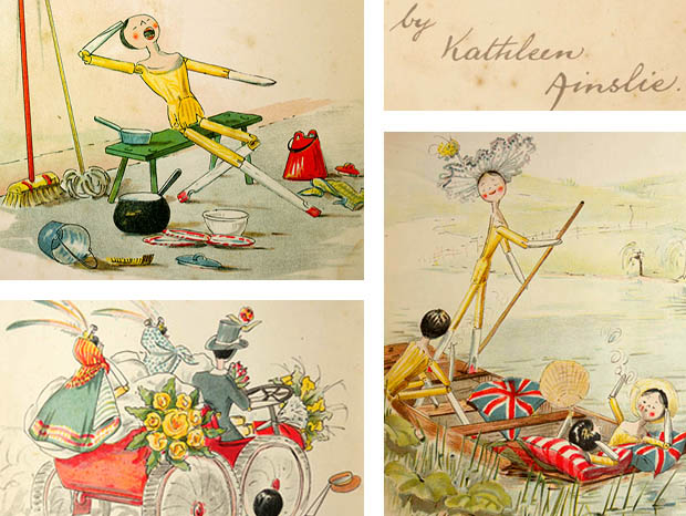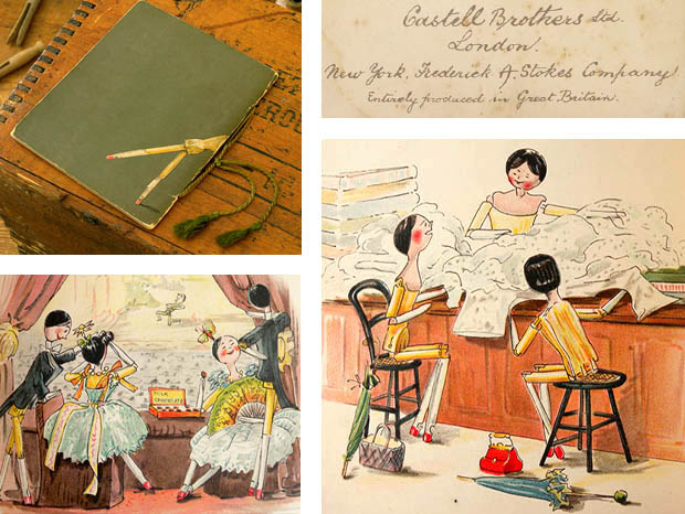 イギリスのロンドンにあるCastell Brothers Ltd.(キャステル・ブラザーズ出版社)とアメリカのニューヨークにあるFrederick A. Stokes Company(フレデリック・アボット・ストークス出版社)が1900年代に同時に出版した厚紙製のキャサリン・スーザン&ミーズカミングアウト・ペグドールピクチャーブックです。Peg Doll(ペグドール)はイタリアの南チロル地方のヴァル・ガルデーナの町で作られた木製のドールが始まりのようですが、その後ドイツやオランダやアメリカで多く製作されたようです。また、Peg Doll(ペグドール)の名前はClothespeg(クロスペグ/洗濯バサミ)のペグから付けられたようです。また、初期の頃のペグドールは木製の洗濯バサミの側面に穴を空けて腕になる木の棒を差し込んだだけのものでしたが、その後にお顔の彩色がされ腕や脚はジョイントで動かせるようになったようです。また、ペグドールは衣服を着せられていない状態で販売されていたようなのでチャイルド達は布切れから自分でドレスを作ったようです。また、ペグドールはPenny Doll(ペニードール)とも呼ばれていますが、これは1ポンドの100分の1のペニー(1セント)の価格のドールのことのようです。また、ペグドールは当時は高価なビスクドールが買えない庶民のチャイルド達のドールでしたが、今では世界中で人気が高くてとても高価なドールになっているようです。こちらは超激レアなペグドール達がデザインされたPicture Book(ピクチャーブック/絵本)で、本体は表紙を入れて全部で36ページあり中ページは文章とカラーイラストが15点でモノクロイラストが1点あります。また、本体はモスグリーンのシルクのフリンジのあるブラウンの紐で中綴じされているのも素敵です。また、ダークグレーの表紙にはCatharine Susan and Me's coming out(キャサリン・スーザン&ミーズカミングアウト/キャサリン・スーザンと私の登場)のタイトルと豪華なお花飾りの付いたハットにホワイトのドレスをきて大きな扇子を持ってピンクの椅子に座ったガールのペグドールと裸のペグドールがタイトルを指差して微笑んでいるイラストがデザインされていています。また、中ページの最初には"Catharine Susan and Me's coming out", by Kathleen Ainslie(キャスリーン・エインズリー作) Castell Brothers Ltd. London(ロンドンにあるキャステル・ブラザーズ出版社) New York, Frederick A. Stokes Company(ニューヨークにあるフレデリック・アボット・ストークス出版社) Entirely produced in Great Britain(イギリスで完全制作)の表示があるのでイギリスとアメリカで同時に出版されたようです。また、1858年にイギリスのサマセット州のコーフの町で生まれたキャスリーン・エインズリーは、1900年から1911年頃に活躍したイラストレーターのようです。また、彼女は19世紀から20世紀初頭にかけて人気があったジョイント式のペグドールを題材にした絵本の出版で有名なようです。また、1878年に創設されたキャステル・ブラザーズ出版社は、バレンタインカードやクリスマスカードの出版で有名なようです。また、フレデリック・アボット・ストークス出版社は、1881年にフレデリック・アボット・ストークスが創設していますが、1939年までの58年間で3,000冊以上の書籍を出版しているよです。また、その次のページからは、That's Maria this is what she says. “I’m sick of housework" so(マリアはこう言っています。「家事にうんざり」だから)の文章とフライパンやお鍋やボウルやバケツの片付けをしないでグリーンの長椅子に座って頭を抱えているガールのペグドールのイラストがデザインされていますが、お話はキャサリン・スーザンとマリアは家事に疲れたので「カミングアウト」することを宣言しますが、彼女達のカミングアウトは、ロンドンへの冒険旅行に出かけることと社会に姿を見せるという意味のようです。また、ペグドールは服を着ていない状態で売られたのでロンドンに行くには素敵な服が必要なので服飾店では、当時流行の素材のモスリンと白のサテンのどちらを着るかで口論となります。また、鳥の羽根や造花で飾られた帽子が流行していたのでペグドール達は鶏を追いかけてハンマーと釘で羽根を頭に固定したりします。また、ロンドンで温かい歓迎を受けた彼女達は舞踏会に招待されます。そして、みんなに王子様だと言っているある紳士と踊ります。また、ポロの試合を見に行ったりパンティング(舟遊び)にも挑戦しますが、この後ペグドール達はどうなってしまうのでしょうか。また、イラストは高価な全て特色を使った石版印刷で刷られているので何年経っても発色がよくて素晴らしいですね。120年も前のペグドールのピクチャーブックですが、見ているだけでペグドールが欲しくなってしまいそうな超激レアな大変価値ある一品です。