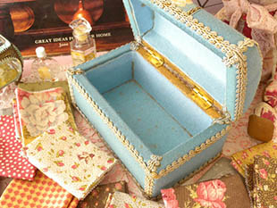 レー)の布ばりされたボワ(ウッド)製のコフレ(小箱、宝石箱)で、フタと本体のフチにはロココ調のような優