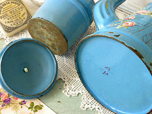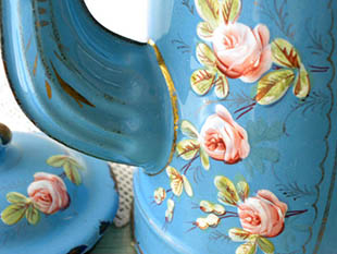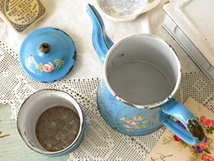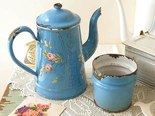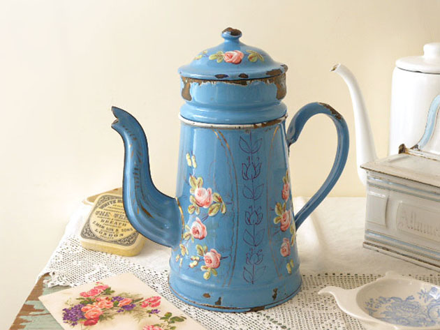 おそらくフランスで1930年代に製造されたホウロウ製のブルー&ブランシュロゼローズカフェティエールで