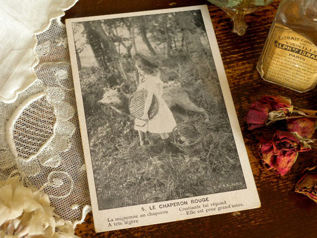 フランスでおそらく1890年代の終わりか1900年代の初頭に製造された未使用の厚紙製のル・シャペロンルージュカルトポスタルNo.2です。こちらは大変レアなLe Chaperon Rouge(ル・シャペロンルージュ/赤ずきんちゃん)の楽しいお話と写真がデザインされたNo.5のCarte Postale(カルトポスタル/ポストカード)で、表面には5. Le Chaperon RougeのロゴとLa mignonne au chaperon, A tete Iegere, Confiante Iui repound, Elle est pour grand'mere(可愛い赤ずきんちゃん、彼女はおばあさんのために心からお祈りをしました)と書かれているようですが、モノクロの写真の病気のおばあさんの家に行く途中の森の道で親切そうな悪いオオカミに出会った白いローブ(ドレス)にルージュ(レッド)のシャペロン(頭巾)をかぶったて葡萄酒の入ったパニエ(バスケット)を草むらに置いて丸いガトー(ケーキ)を抱えたシャペロンルージュの姿がオシャレで可愛くてとてもいい感じです。また、写真のクオリティーがとても高くて素晴らしいですね。また、裏面にはcarte postale, Tous les pavs etrangers n'acceptent pas lacorrespondance au recto(外国への郵送は郵便ポストでは対応していません) Se reseigner a la poste(郵便局にお持ちください)と書かれているようです。シャペロンルージュはフランス人のCharles Perrault(シャルル・ペロー)が1697年に出版した「ペロー童話集」の中にありますが、1812年頃にグリム兄弟がアンファン(チャイルド)達のために可愛くリメイクして有名になったようです。110年以上も前に製造された可愛いル・シャペロンルージュカルトポスタルNo.5です。